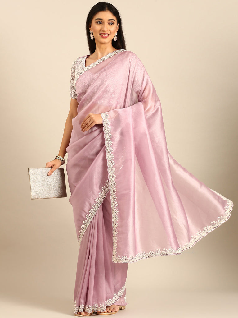 Lavender Jimmy tissue saree with pearls & beads embroidery with heavy ready made blouse