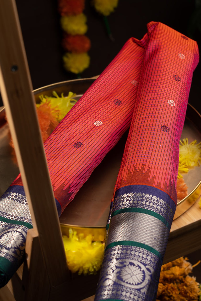 Mandir Light Pink & Royal Blue Gadwal Checks And Buttis Saree