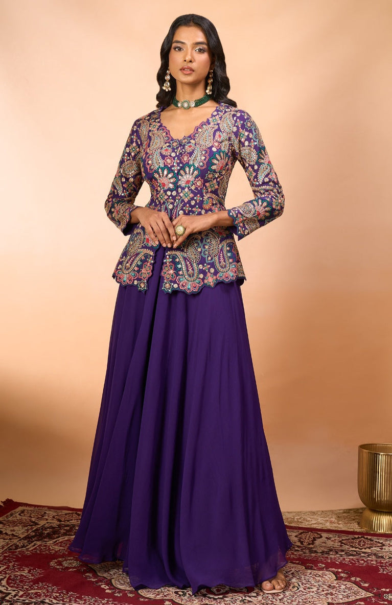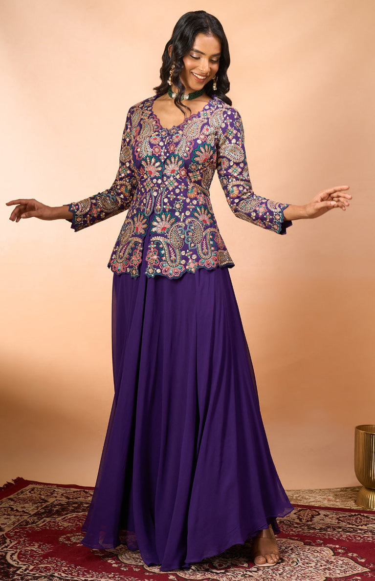 Purple Indo-Western Ensemble with Mrunal Rao Pattern & Multicolor Thread Work | Chinnon Fabric Plazo