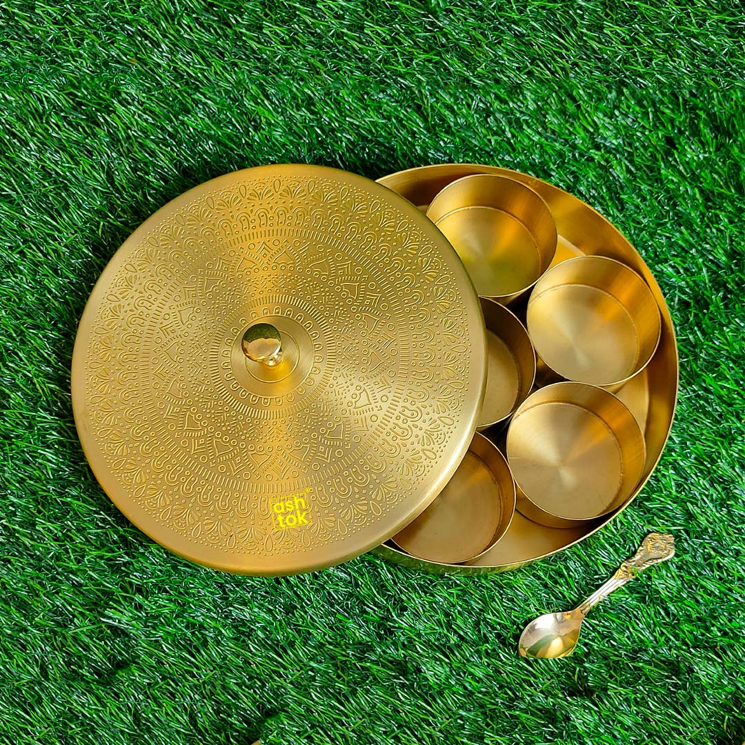Ashtok Brass Spice Box, Masala Box with 7 Cups and 1 Spoon & Lid, Floral Crafted Design