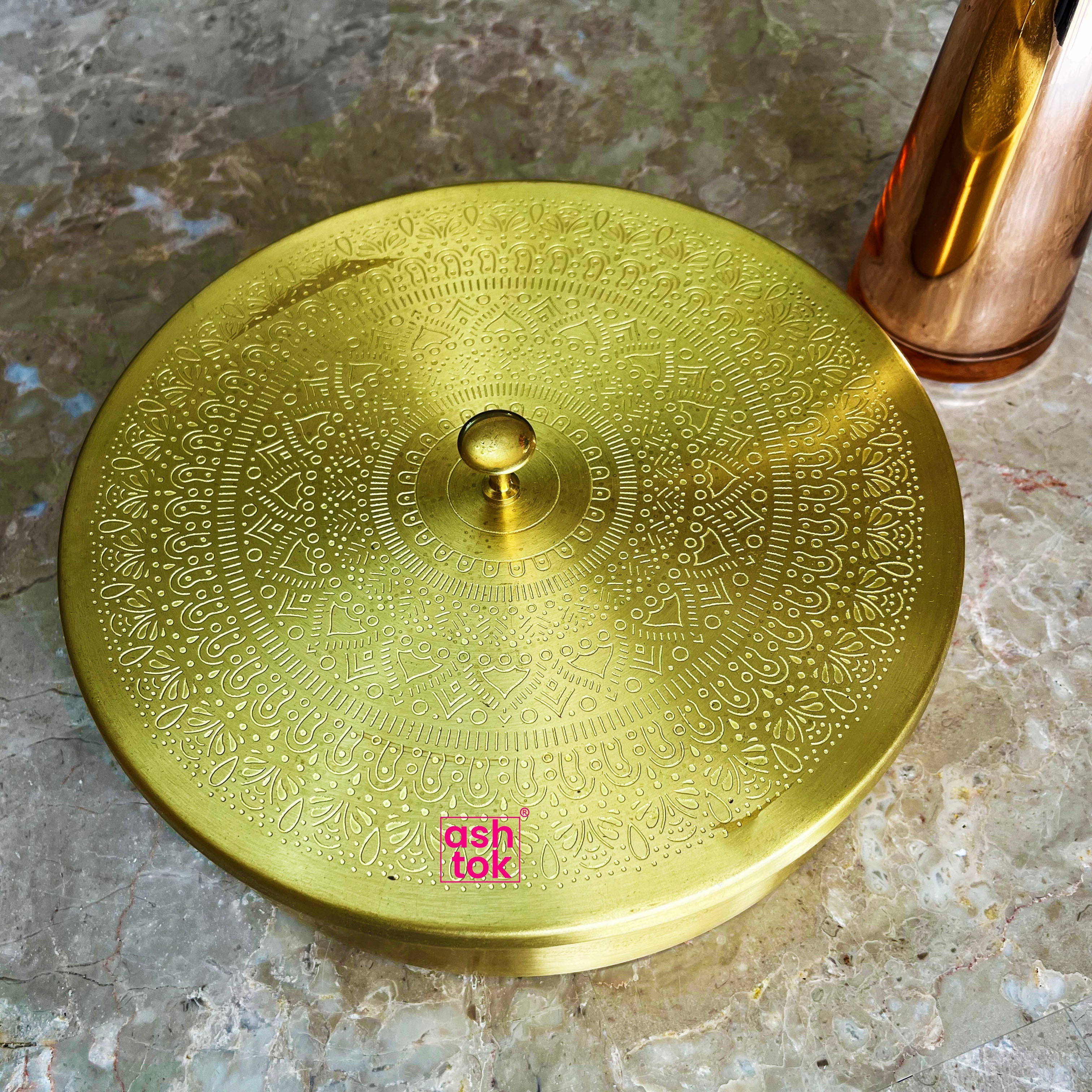 Product Details: India is famous for its spices around the world. Almost 6 to 7 spices on average in all dishes daily in the sub-continent. So, it is quite difficult to keep all the spices in separate boxes. If we can have all the spices in one single box, then it will make life easier and more organized. Ashok introduced a masala box with a diameter of the box is 7 Inches and a Height is 2 Inches. The box comes with 7 cups of Diameter of 2 Inches and a Height of 1.25 Inches. The 7 cups are used for different spices. The box is provided with a lid that has floral engraving work on it. The lid is provided with a knob to pull the lid when in use. The box is made of thick brass sheets. The sizes of the cups are such that they get fixed in the box and are not easily movable. This will prevent the spices from spilling out of the box.
