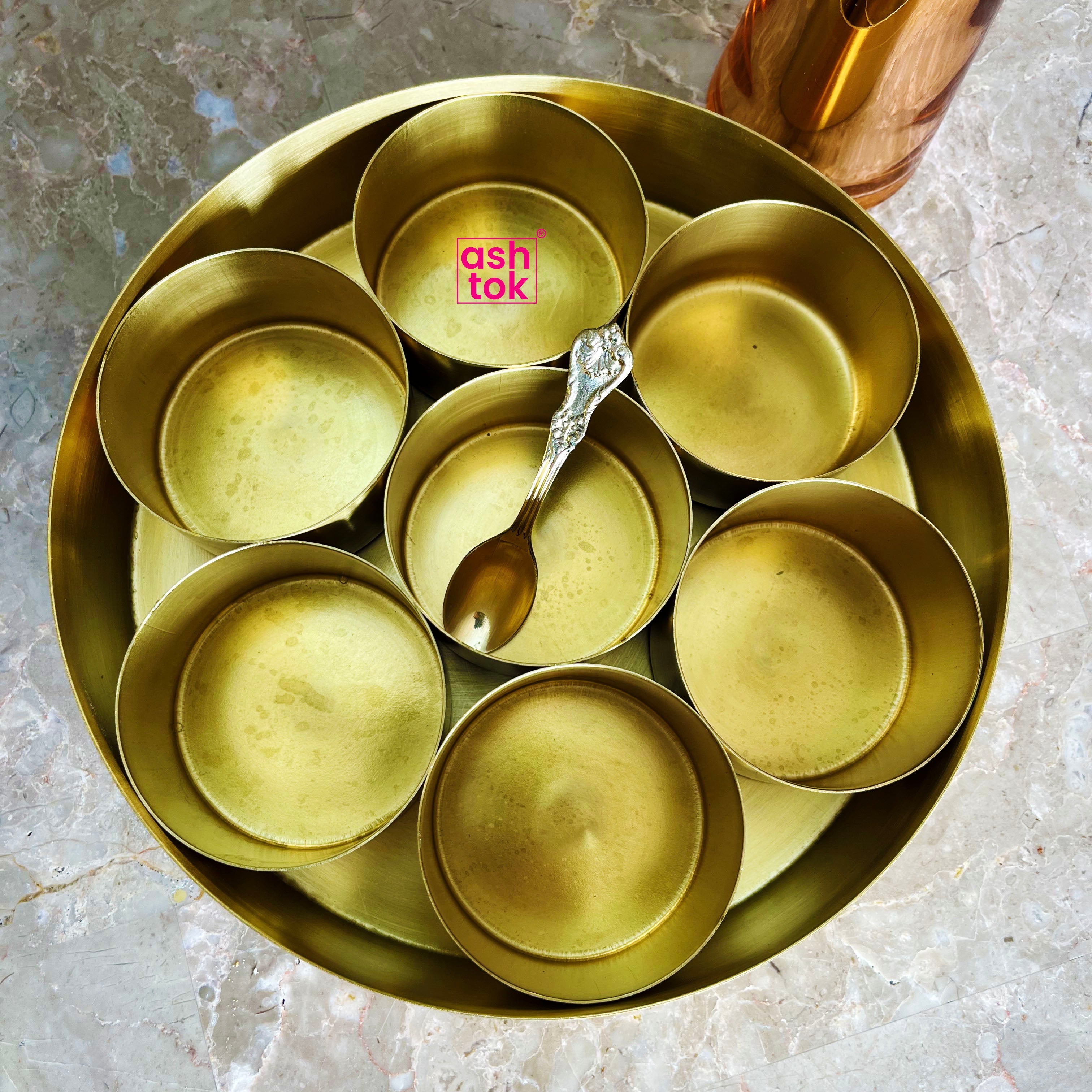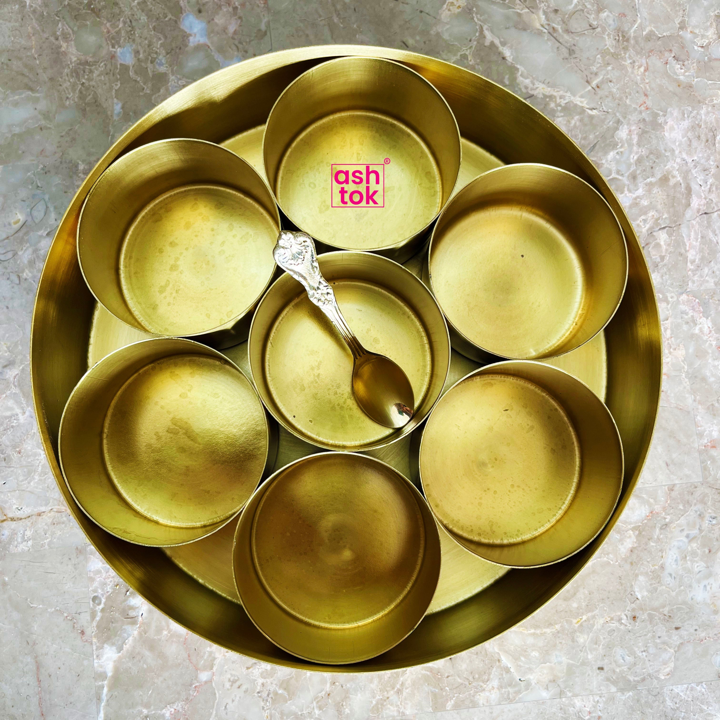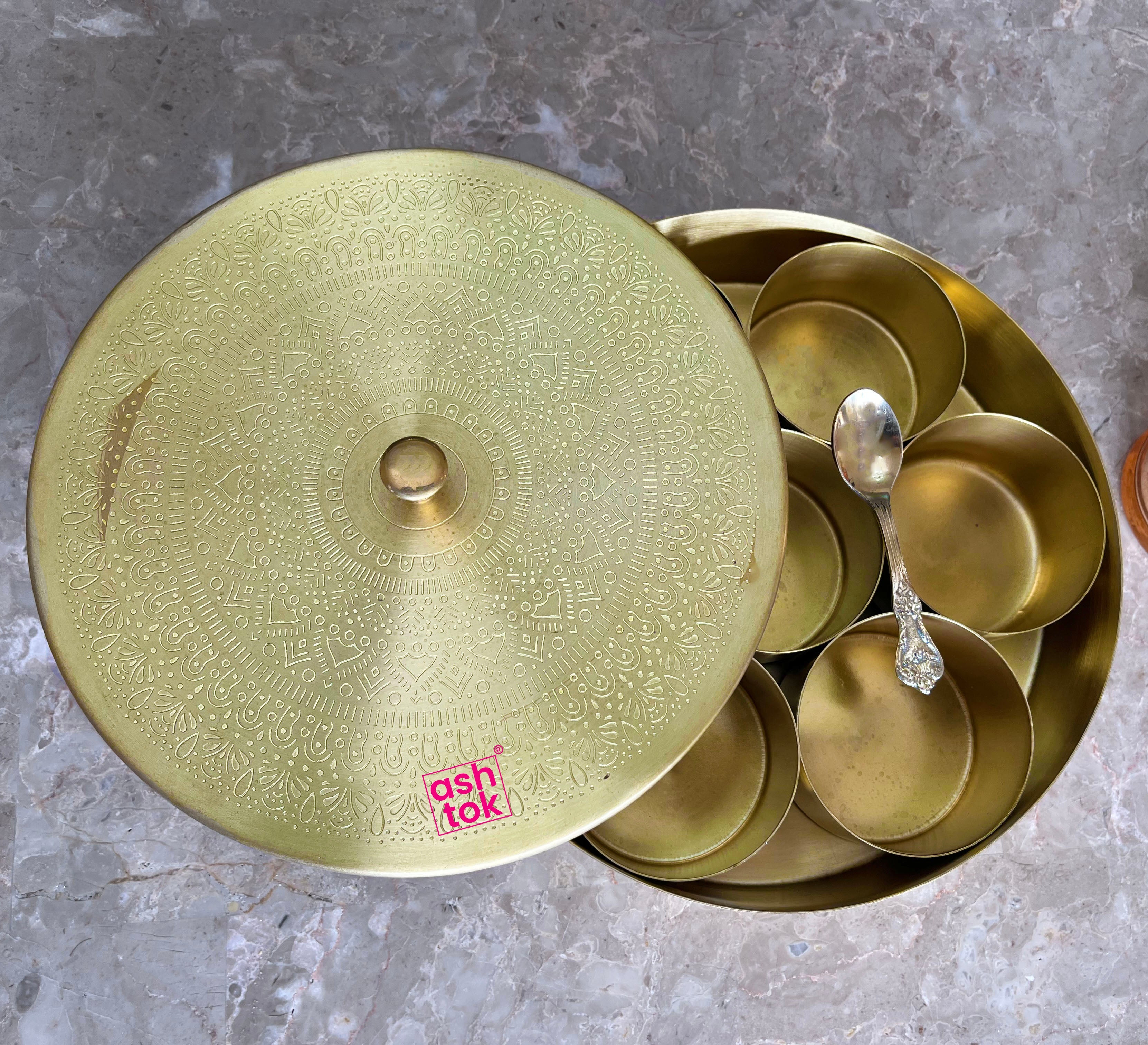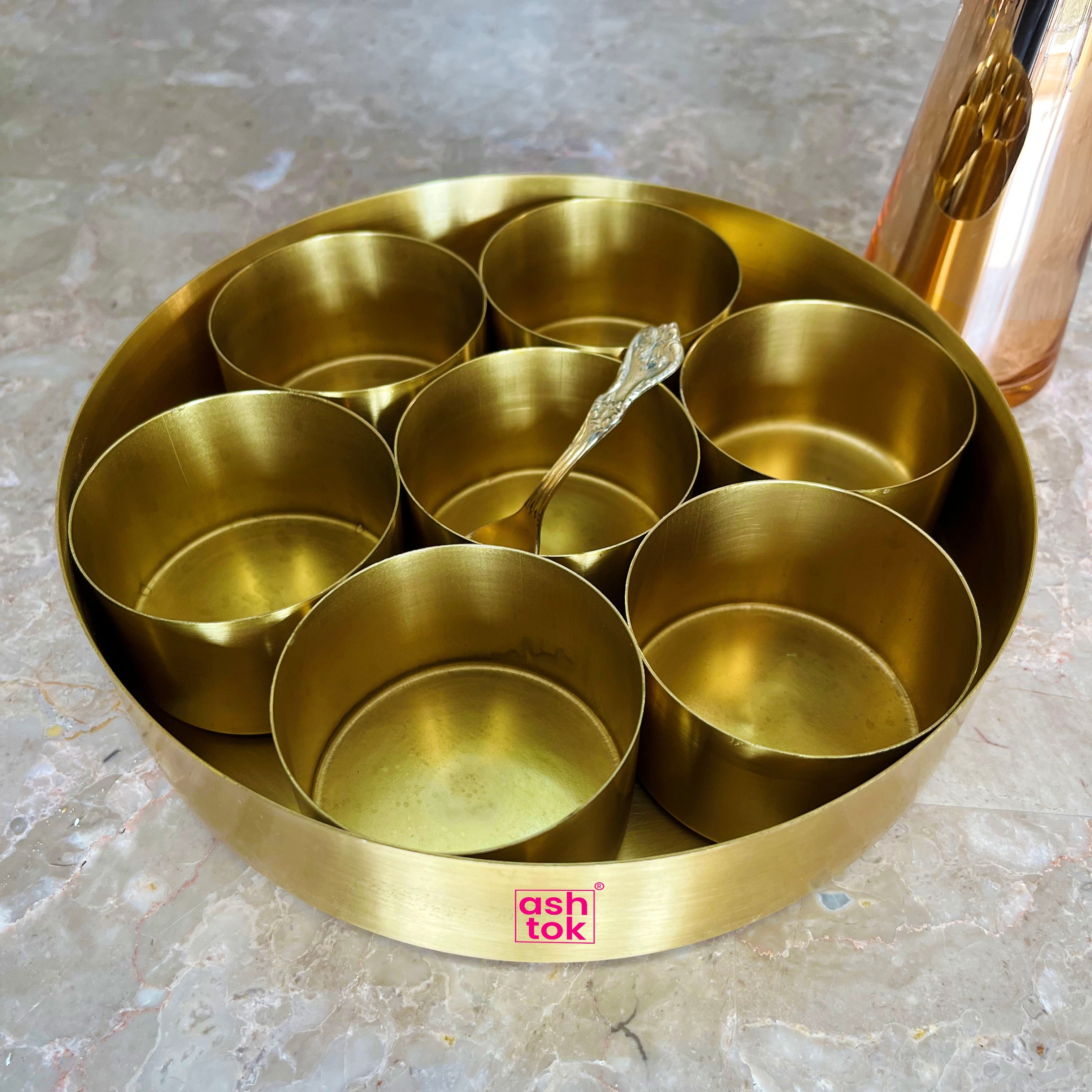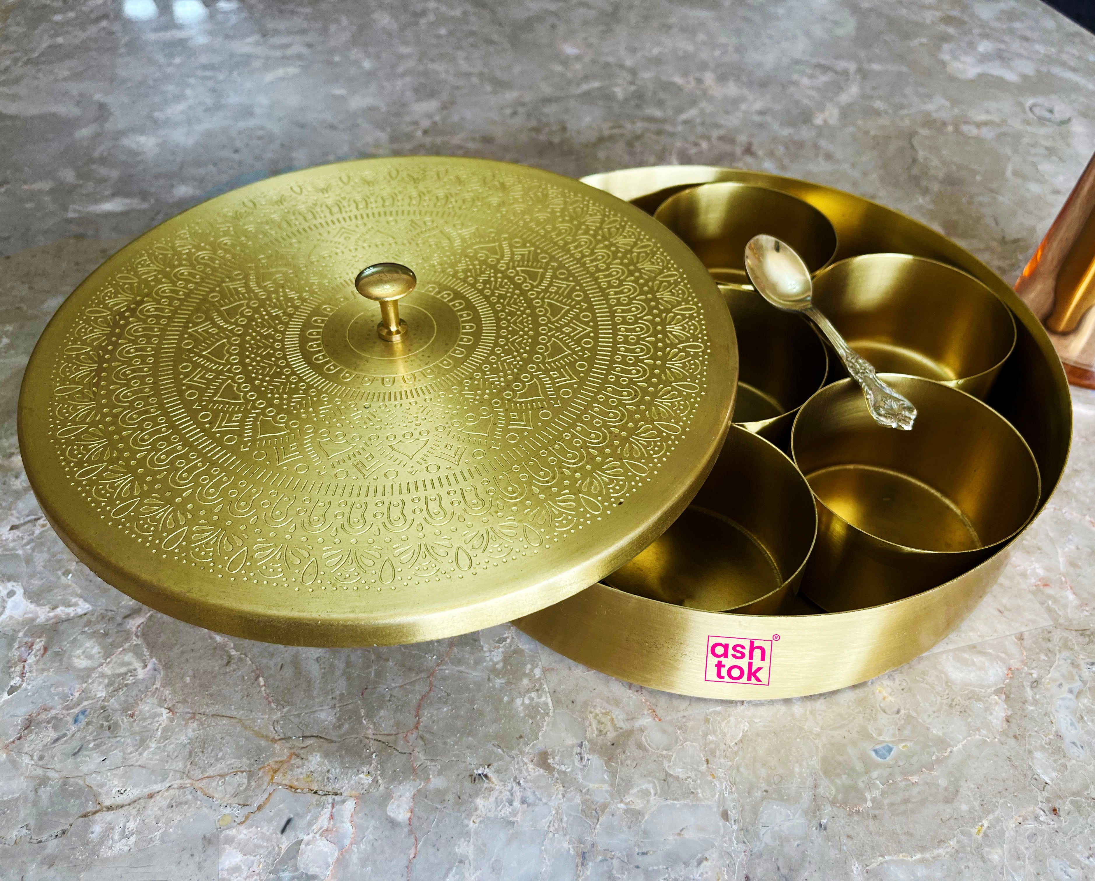 Package Contains: 1 Brass Masala Box Set with 7 Cups, Spoon, and Lid.