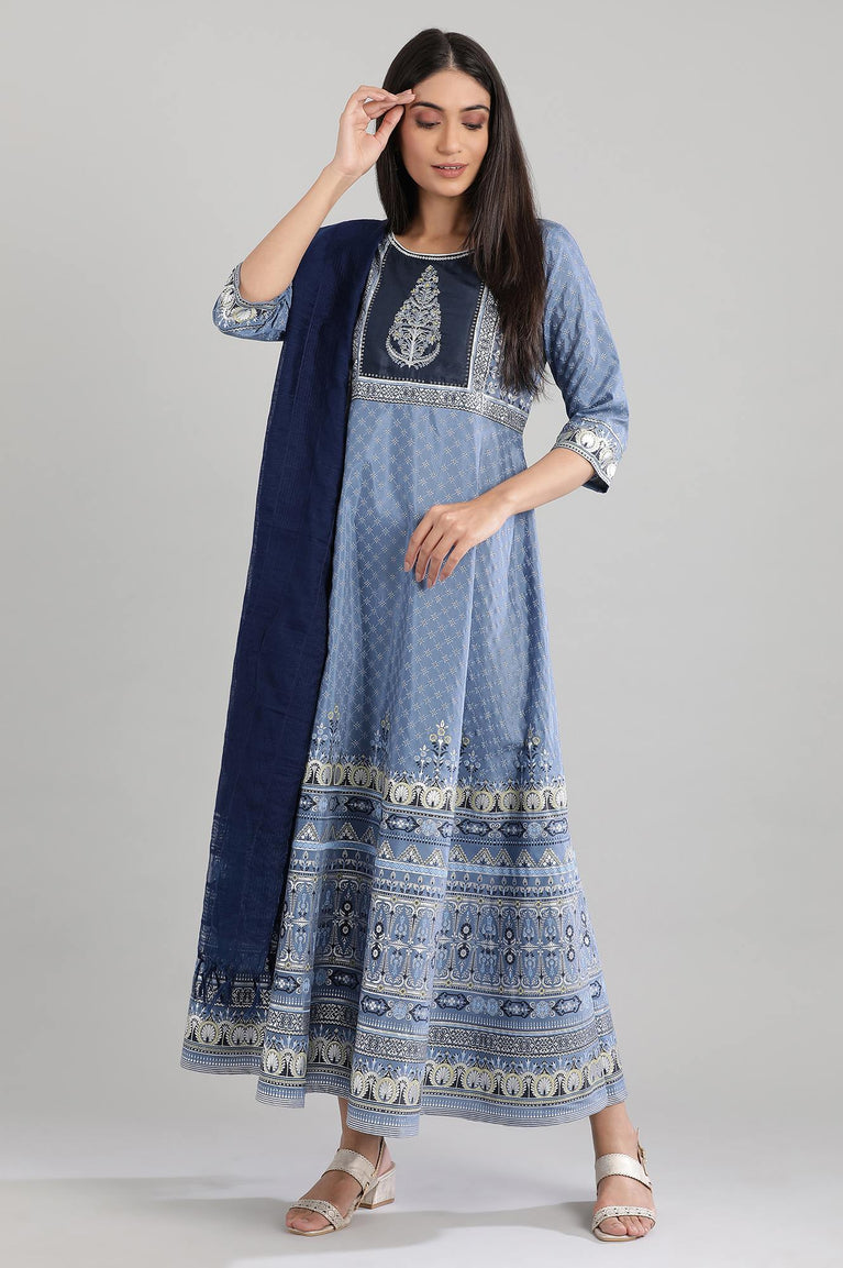 Light festive indian ethnic dress in sodalite blue colour is embellished with foil print and have border on hem and sleeves. It has mandarin collar with button closure.
