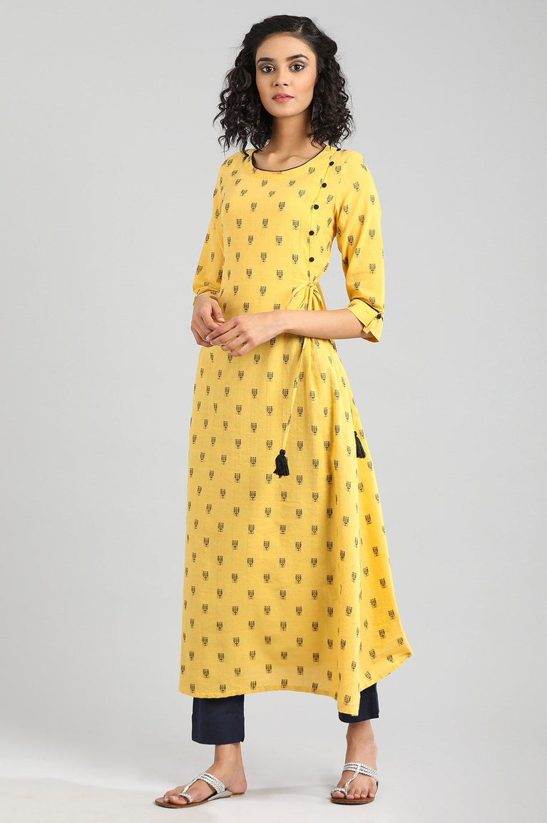Give winter chills a warm welcome with this Ink blue winter ethnic winter kurta. This straight silhouette kurta features round neck and geometric print with border at hem.