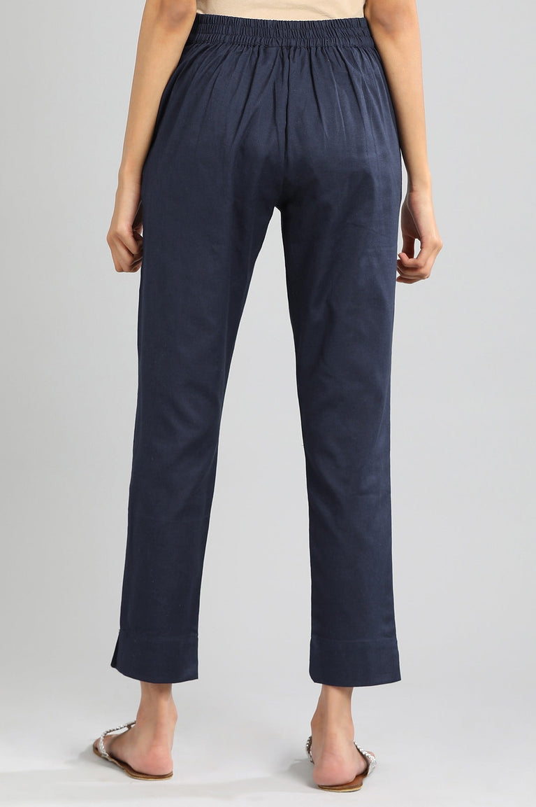 Blue solid trousers with elasticated back.