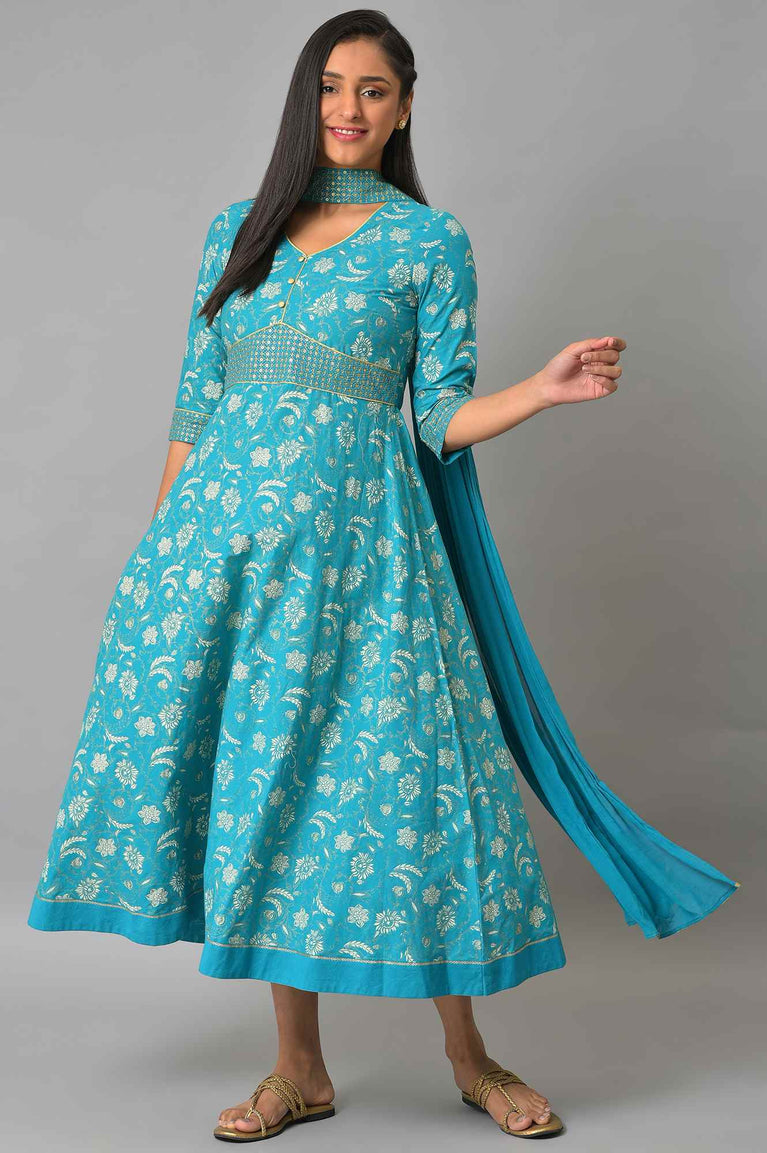 This blue thread work cotton blend straight kurta and palazzo set combines comfort, elegance, and thoughtful design in a way that fits seamlessly into your wardrobe. The blue tone lends a calming yet refined presence, making it ideal for day-to-evening transitions. The silhouette flatters most body types, while the choice of cotton fabric ensures breathability and movement. Whether styled for festive gatherings, office hours, or weekend outings, this outfit adapts with grace. The coordinated bottoms—be it pants, jeggings, or skirts—add functional elegance and lend structure to the ensemble. Subtle accents like thread work, zari, or embroidery further enhance its ethnic charm without overwhelming the design. Layer it with delicate jewellery and a tonal dupatta to dress it up, or keep it minimal for everyday grace. This cotton kurta set brings versatility and fashion-forward ease to modern women's ethnic wear collections.