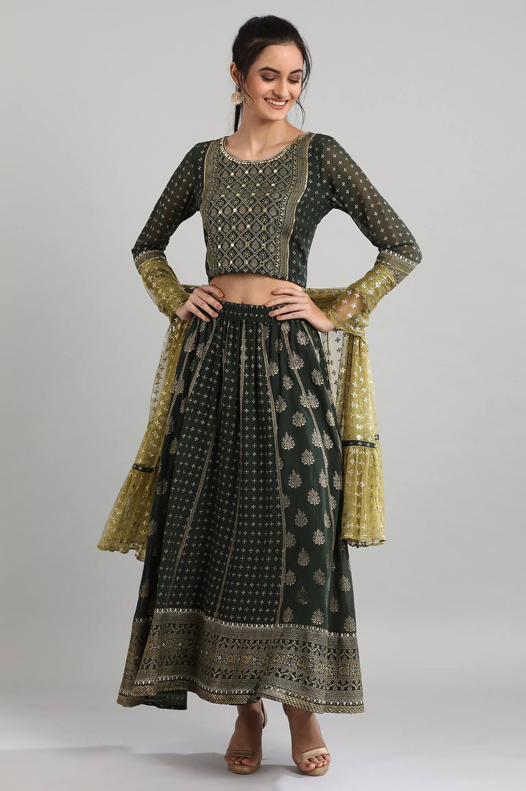 This ethnic set has a black round neck 3/4 sleeve crop top with printed and mirror detail, a black flared skirt with printed, embellished and mirror detail and a green embellished dupatta.