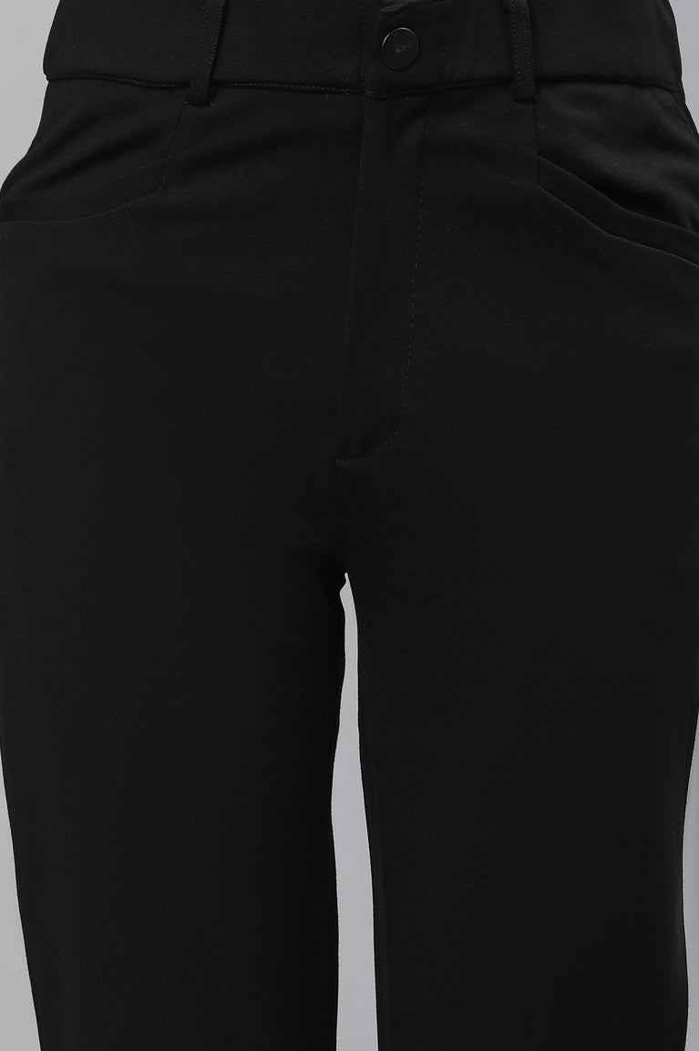 Crafted for the modern professional, these black slim-fit trousers combine style and comfort effortlessly. The knit fabric offers a soft hand feel and stretchability, ensuring all-day ease. Featuring functional front pockets and a front zip with button closure, these trousers are perfect for formal occasions. The elasticized waist belt adds a touch of convenience, making them easy to slip on. Pair them with a crisp shirt or a chic kurti for a polished look that transitions seamlessly from office to evening.