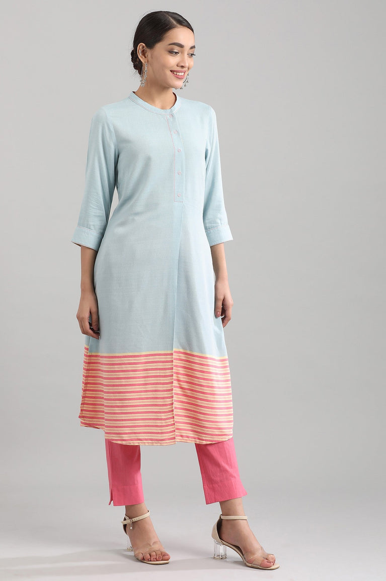 Blue band collar straight Liva kurta yarn-dyed Liva kurta with placket detail, cuff sleeves and button.