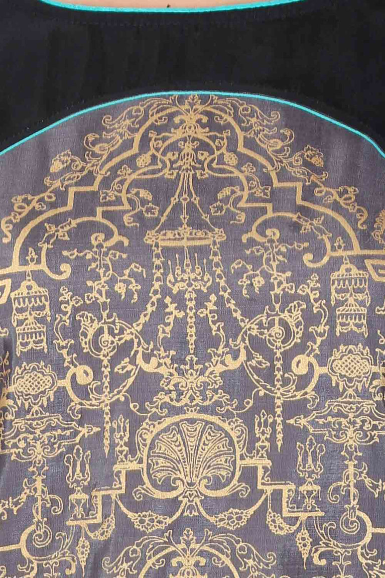 Our printed anarkali kurta is a statement piece. It features a round neck adorned with piping and contrasting buttons on the front panel, adding a trendy twist to the design. Additionally, a dori tie is provided for easy adjustment, ensuring a comfortable and flattering fit. This kurta is perfect for elevating your style with its combination of traditional and modern elements.