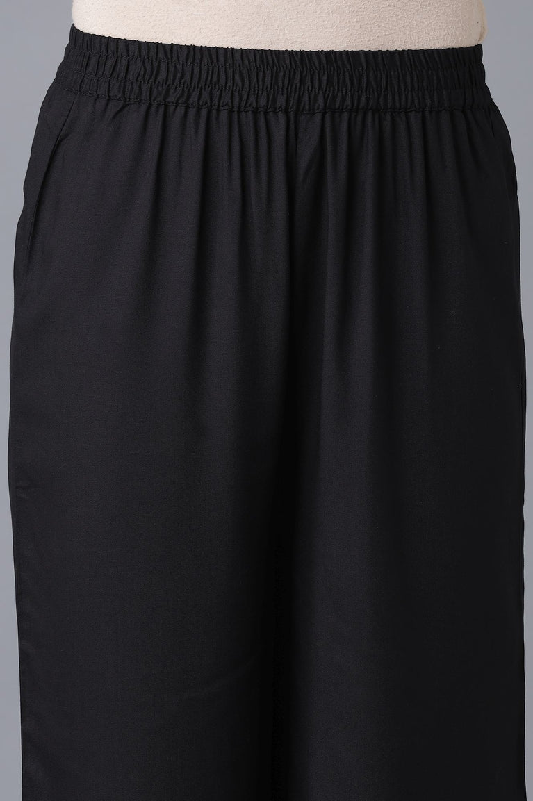 Black printed kurta in round neck and three-quarter sleeves. Paired with matching mid-rise palazzo.