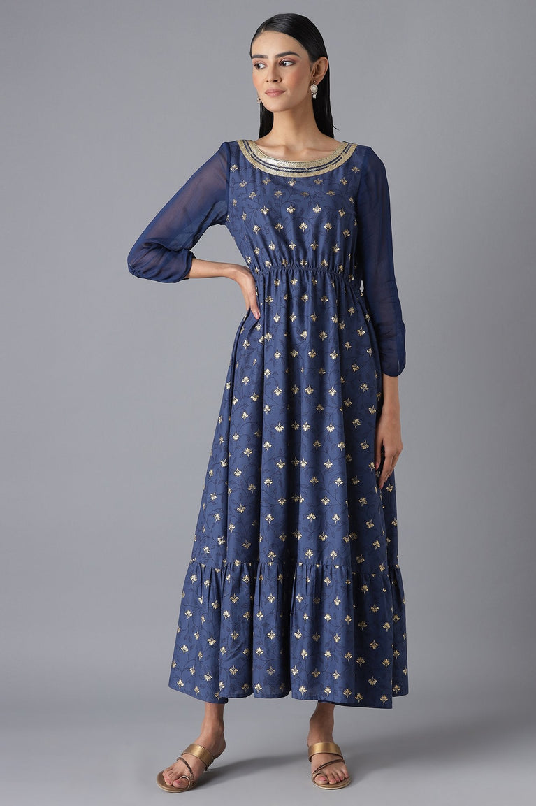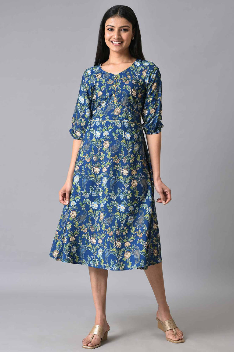 Blue Floral Printed A-Line Dress