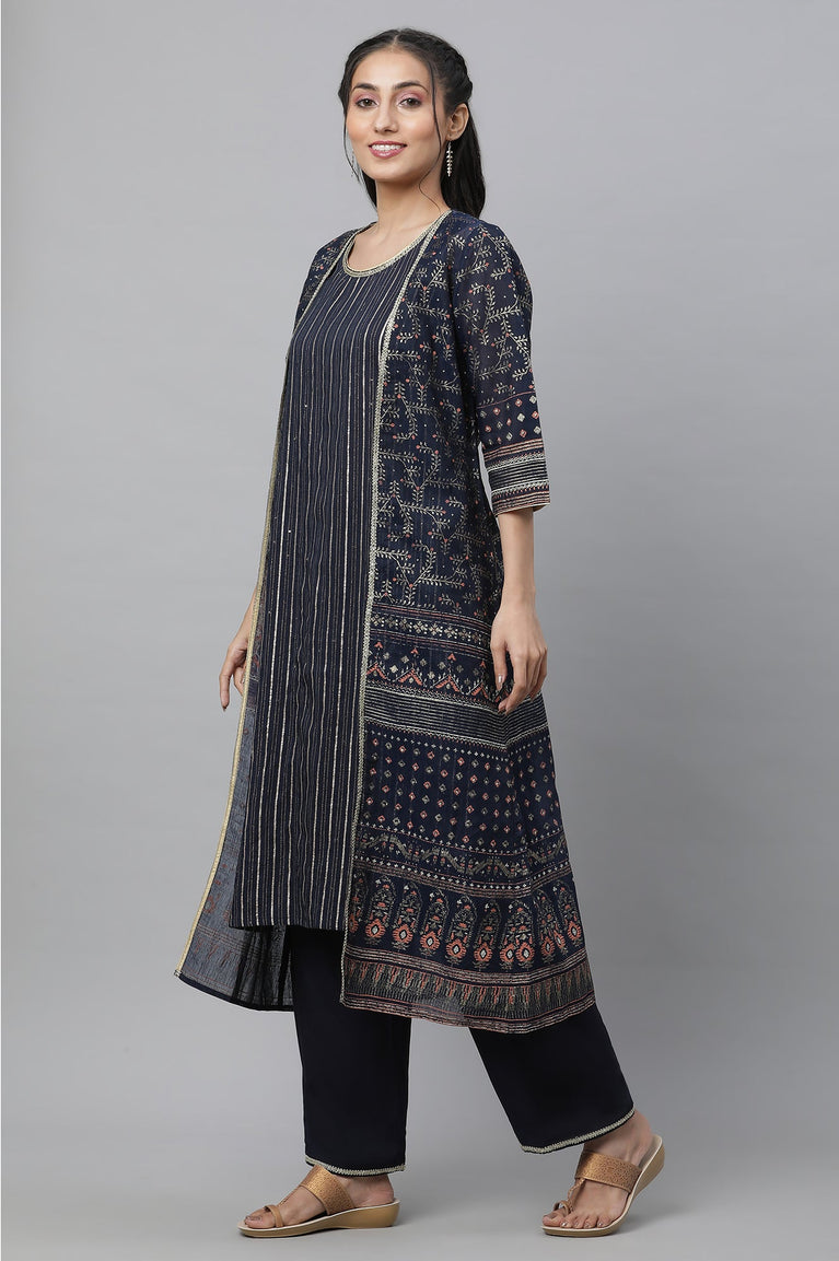 Blue Floral Printed Straight Kurta, Pants and Dupatta Set