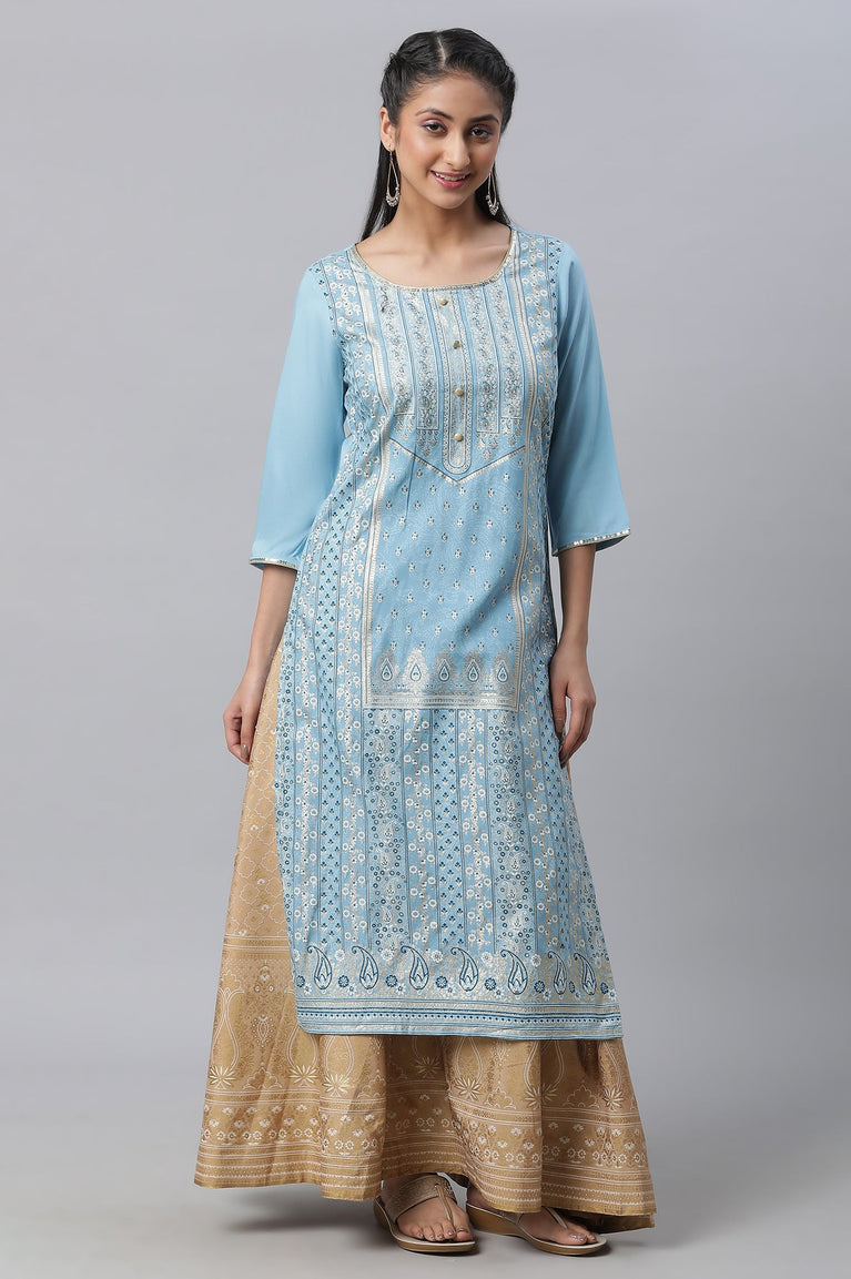Blue round neck loose fit kurta with printed detail.