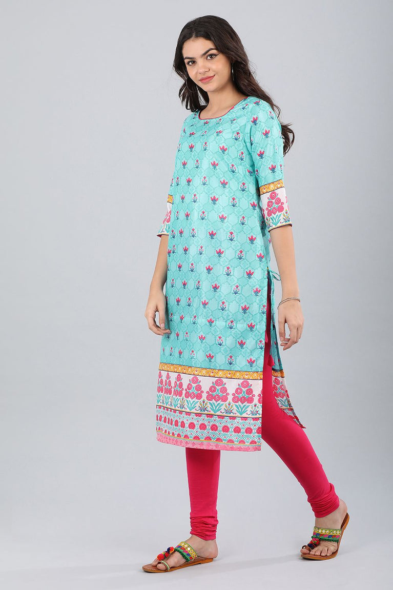 Give Your Casual Wear Collection A Stylish Upgrade With This Ice Blue Placement Printed, Straight kurta. It Features The Perfect Blend Of Playfulness And Simplicity. The Contrast Neck Binding With A Top Stitch, Lace Insert And Mini Cutout Uplifts The Look..