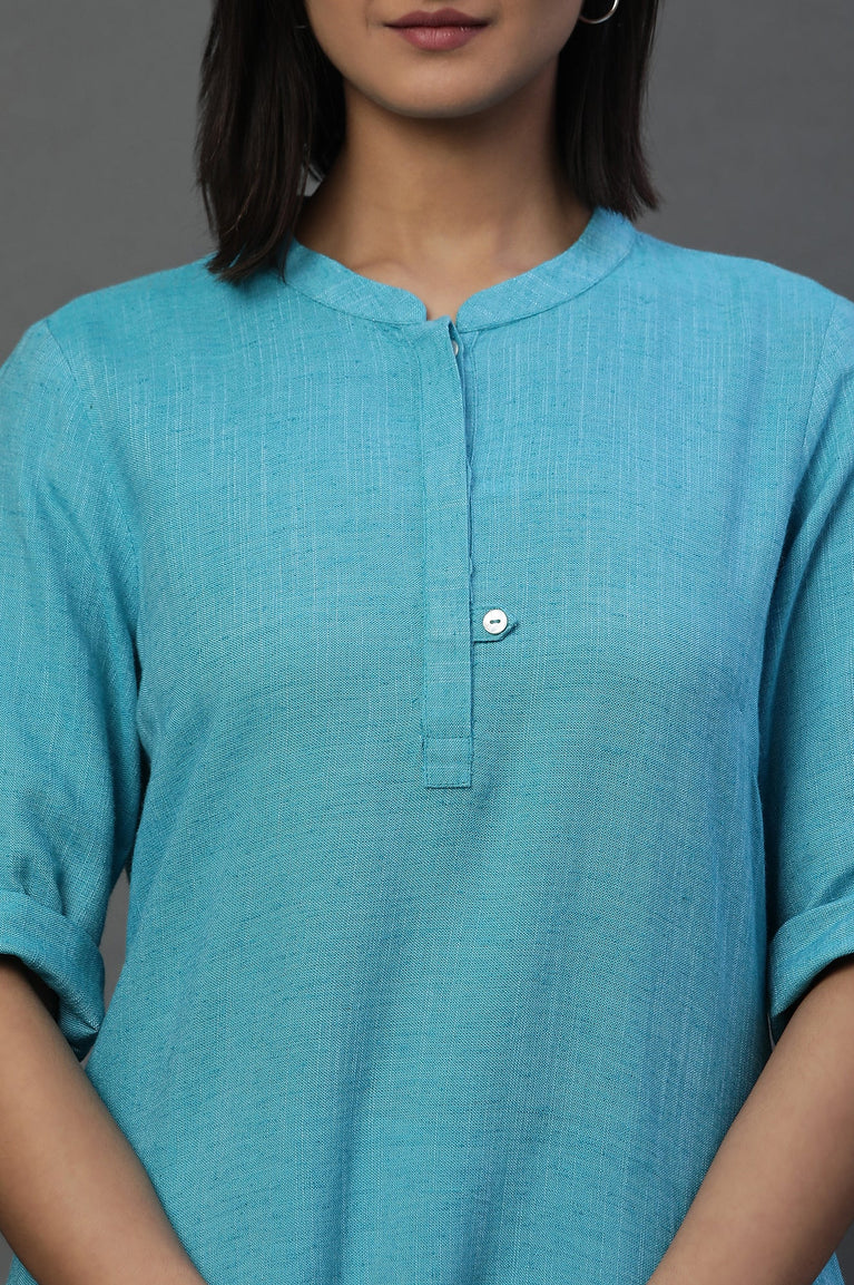 Blue coloured straight dress having shirt collar with buttoned placket and three-quarter sleeves.
