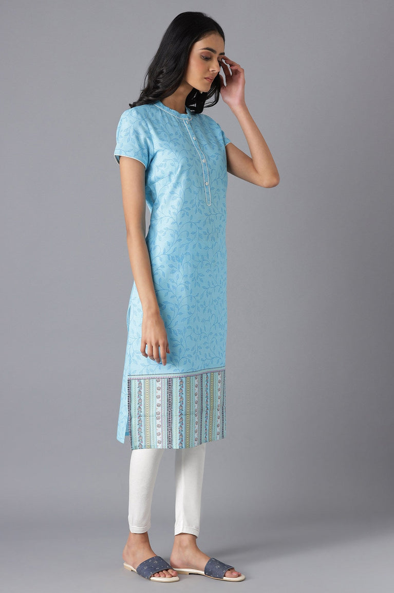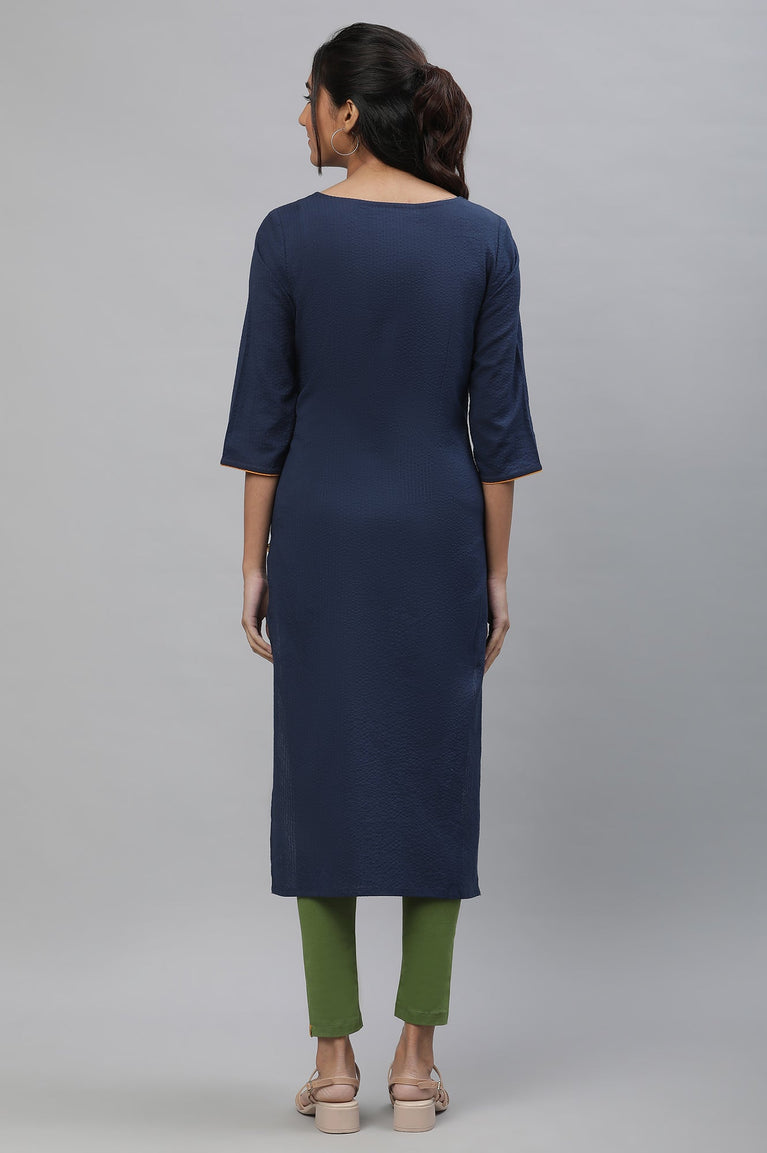 Blue round neck straight yarn-dyed Liva kurta with geometric pattern detail.