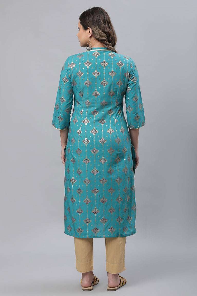 This blue boat neck 3/4 sleeve kurta has side slits.