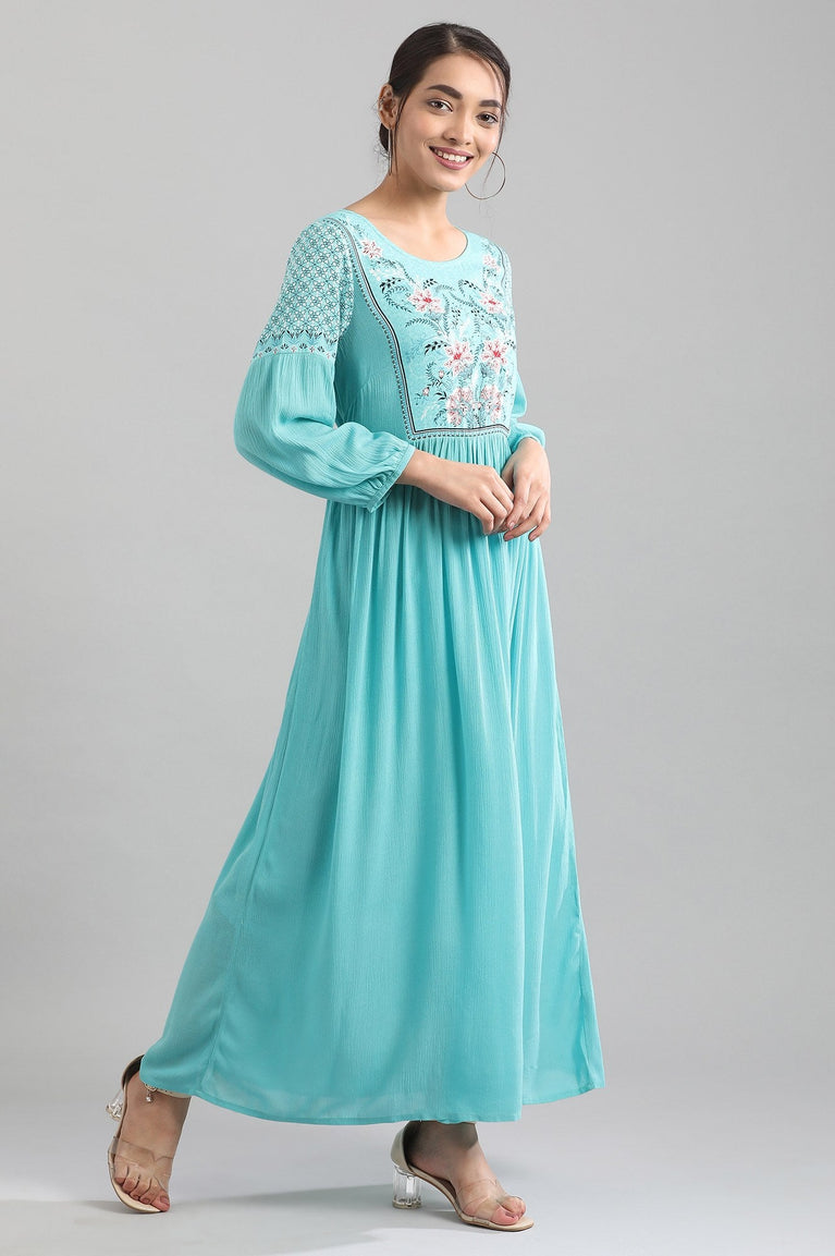 Let's get sorted for the next festive look with this gorgeous flared dress by Aurelia. The dress has circular body detail and mandarin collar, the yoke is adorned with zari embroidery and it flatters ornamental pattern all over. The dress has elegant three-quarter sleeves with embroidered cuffs.