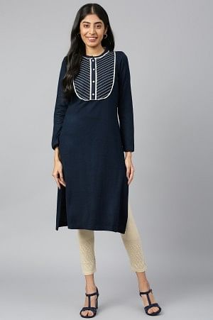Turn Your Casual Look Into A Stylish One With This Knitted Dark Navy kurta. It Has Band Collar With Button Placket And Features Thread Embroidery.