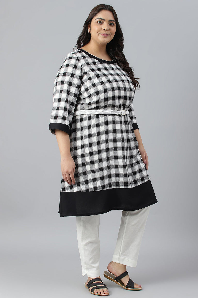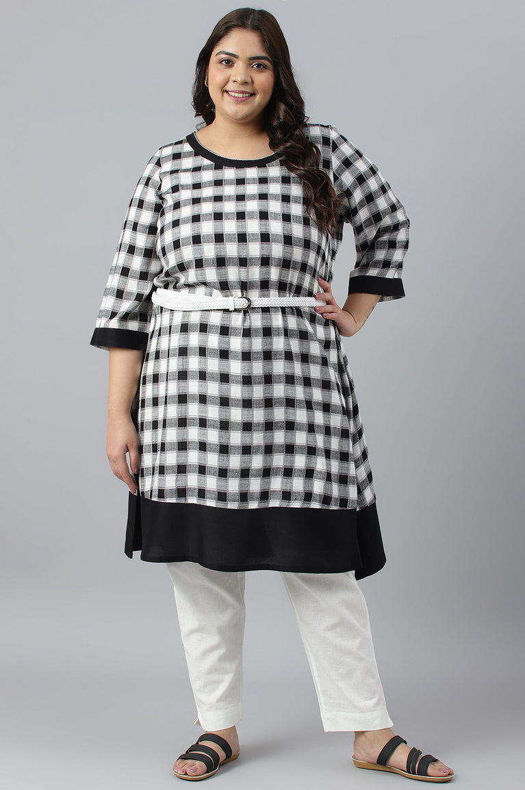 Crafted In Soft And Breathable Dobby, This Modern Checkered A-Line kurta With A Belt At Waist For Cinching Is Definitely A Go-To Choice. This Ensemble Can Be Paired With A Tonal Black Cropped Tights.