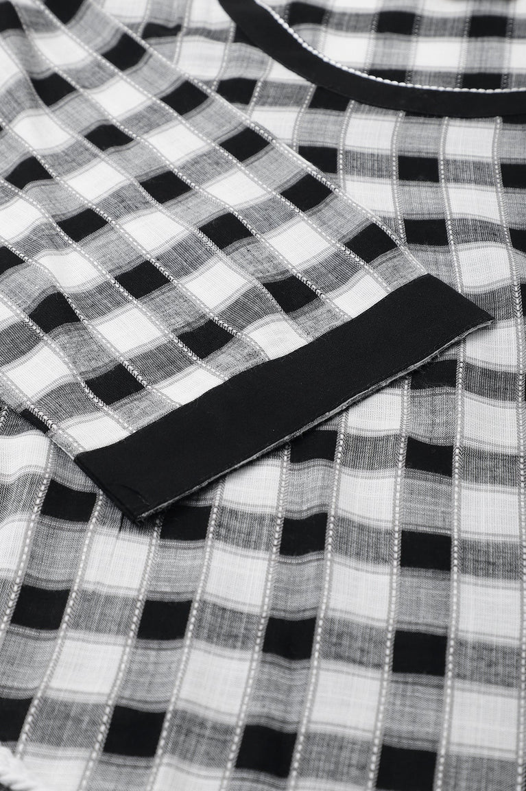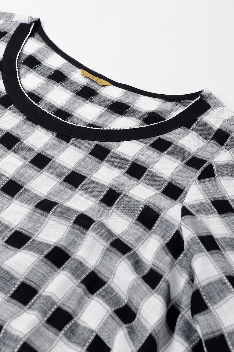 Style this checker kurta set for your lunch date or shopping outing. The set has black and white coloured check print all over and round neckline. It comes with white waist belt. The kurta is paired with white tights.