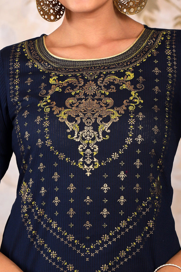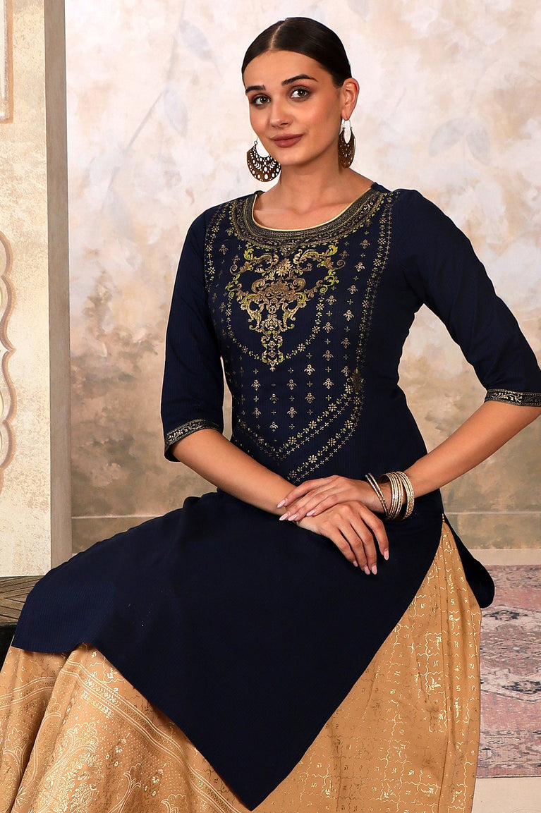 A canvas of deep sapphire artistry, this straight silhouette kurta for women is a testament to timeless grace. This garment flows with an understated elegance, designed for moments that call for a touch of traditional splendor. Its classic round neckline serves as the perfect frame for a magnificent yoke, which is lavishly decorated with intricate, multi-hued floral embroidery that cascades beautifully down the front. This detailed ornamentation is a stunning display of craftsmanship, transforming the tunic into a piece of wearable art. The three-quarter sleeves are thoughtfully designed, culminating in a matching embroidered border that mirrors the yoke's rich beauty, adding a harmonious finish to the design. Crafted for comfort and a flattering fit, this ethnic tunic features a clean straight hemline with side slits, ensuring ease of movement. The fabric is fully opaque, offering complete coverage and confidence. You’ll find this navy blue embroidered kurta to be a wonderfully versatile addition to your festive ethnic wear wardrobe. It’s an essential piece for anyone seeking a blend of classic design and modern appeal, perfect for celebrations and special gatherings where making a sophisticated impression is key. This single-piece kurta is a celebration of exquisite detail.