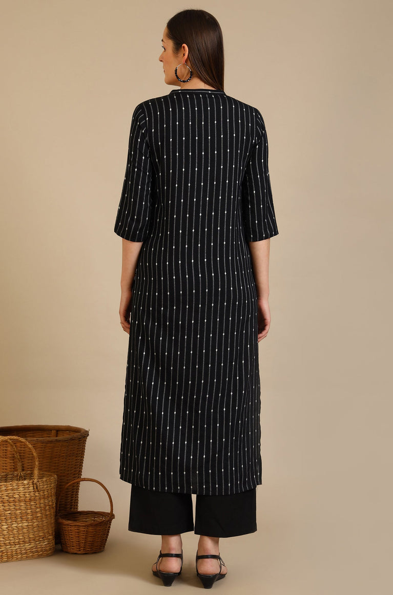 This elegant straight kurta in classic black is designed with a stylish Mandarin collar and a placket for a refined look. The 3/4th sleeves add to its timeless appeal, while the yarn-dyed fabric ensures both comfort and durability. Perfect for any occasion, this kurta offers a versatile and sophisticated addition to your wardrobe.