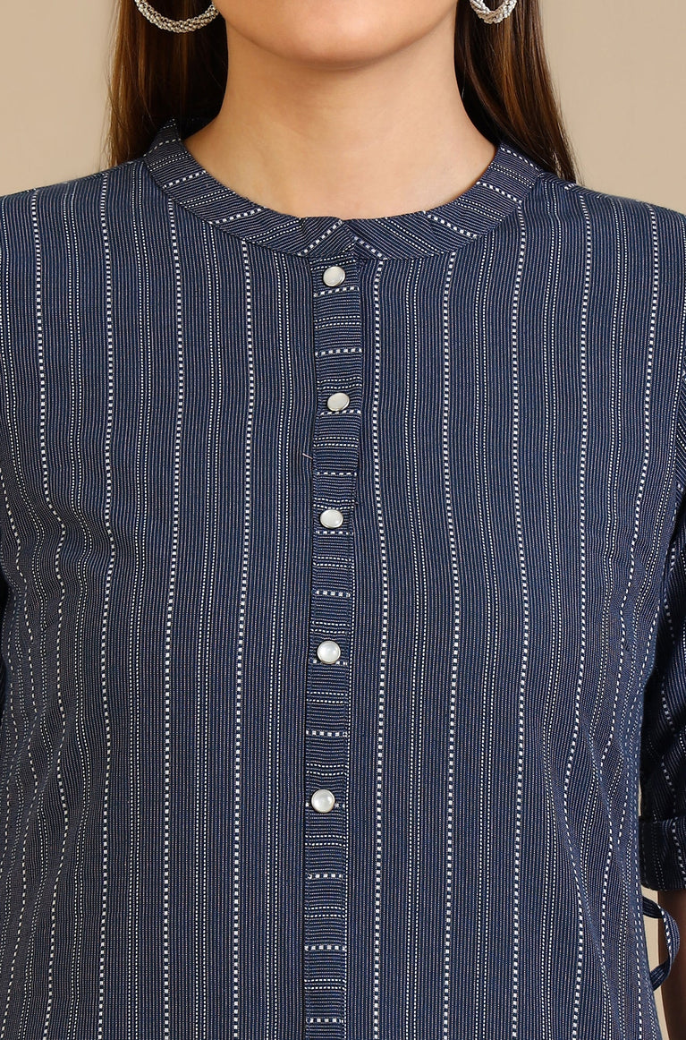 Blue Striped Pure Cotton Mandarin Collar Straight Kurta