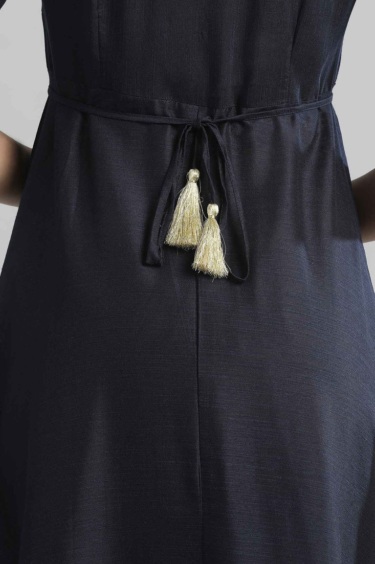 This blue round neck 3/4 sleeve kurta has flared hem.