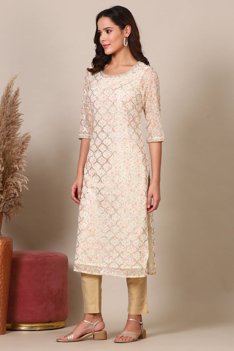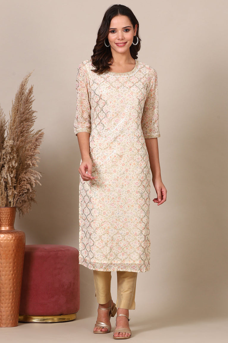 Cream Abstract Printed Organza Sheer Straight Kurta with Mirror Embroidered Neck