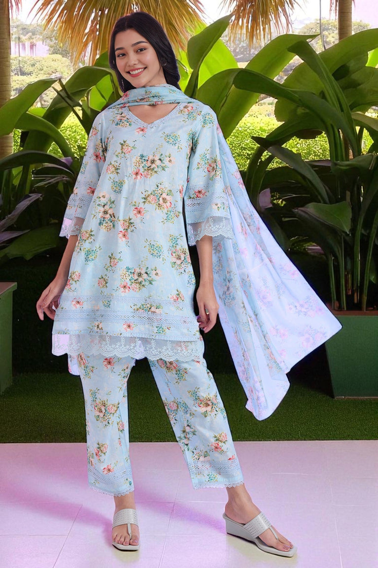 Blue Printed Straight Kurta with Palazzo & Dupatta Set