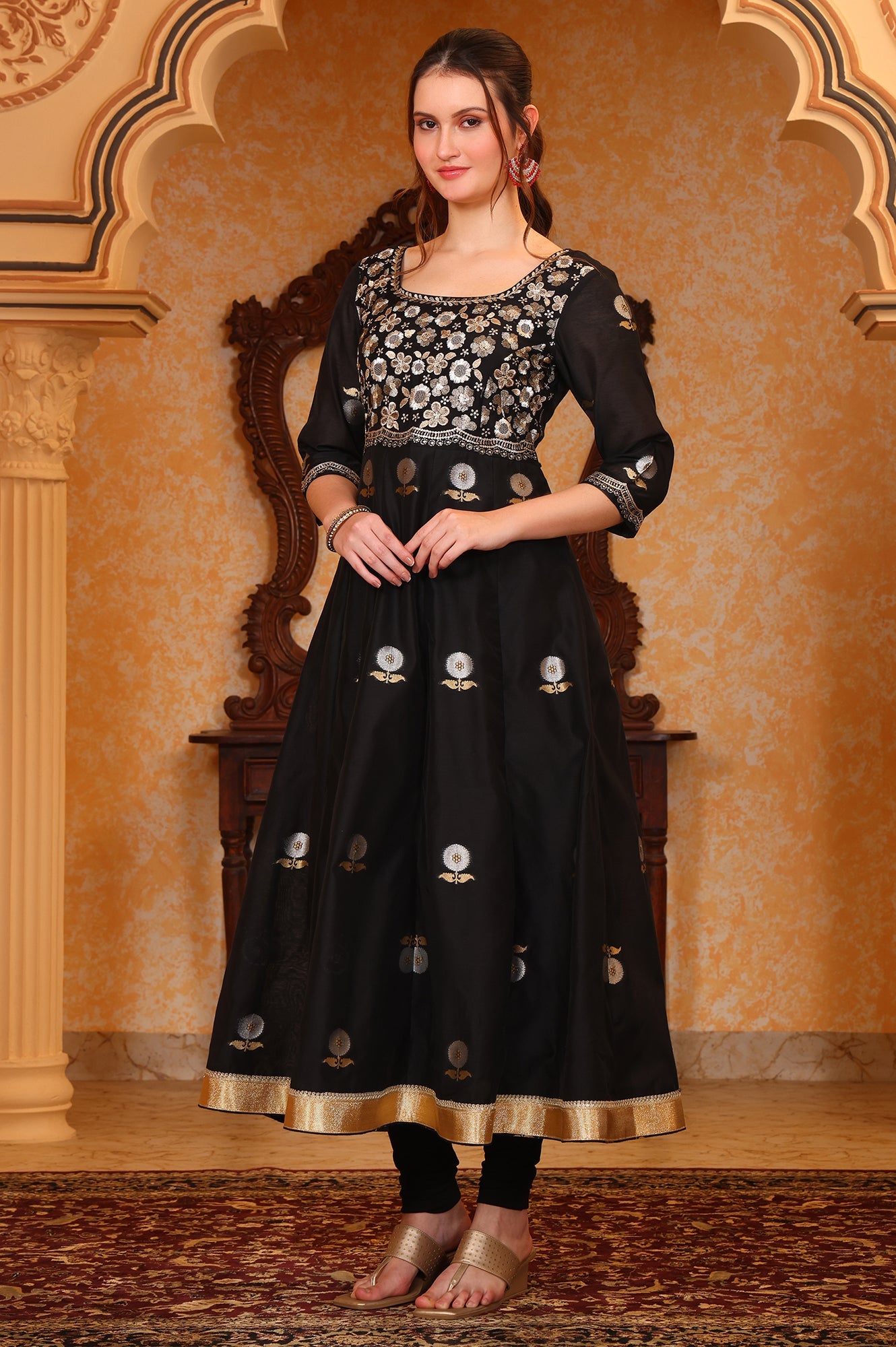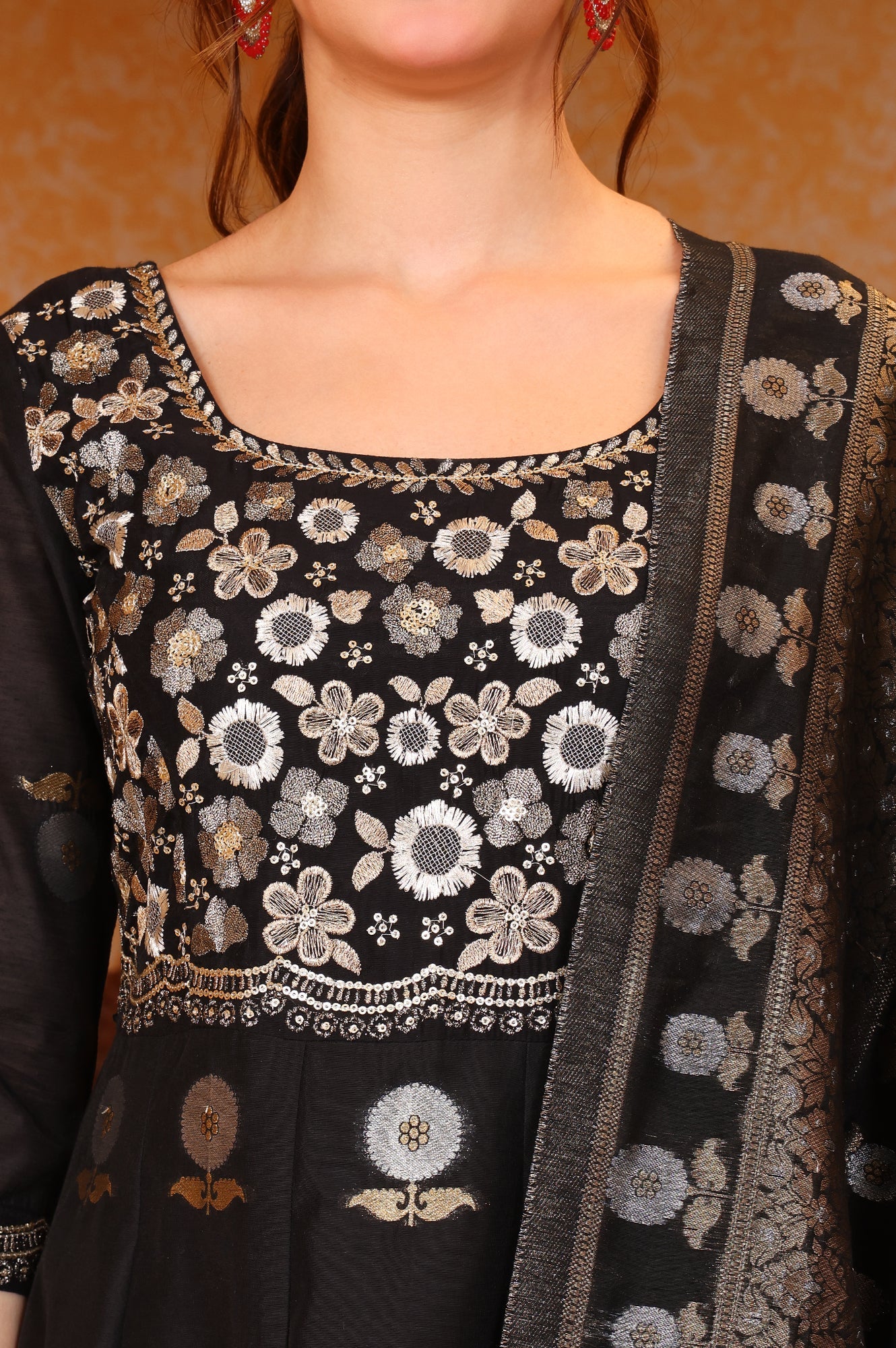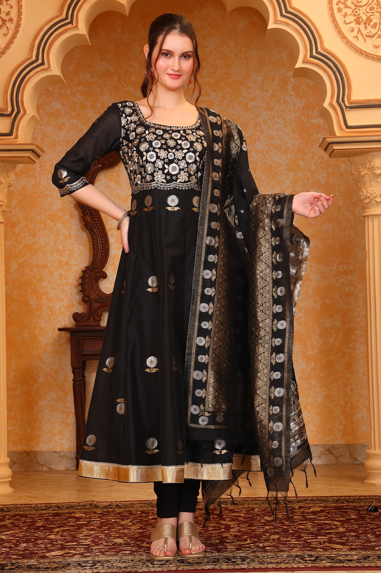 Black Metallic Embroidered Anarkali Jacquard Kurta, Tight and Dupatta Set