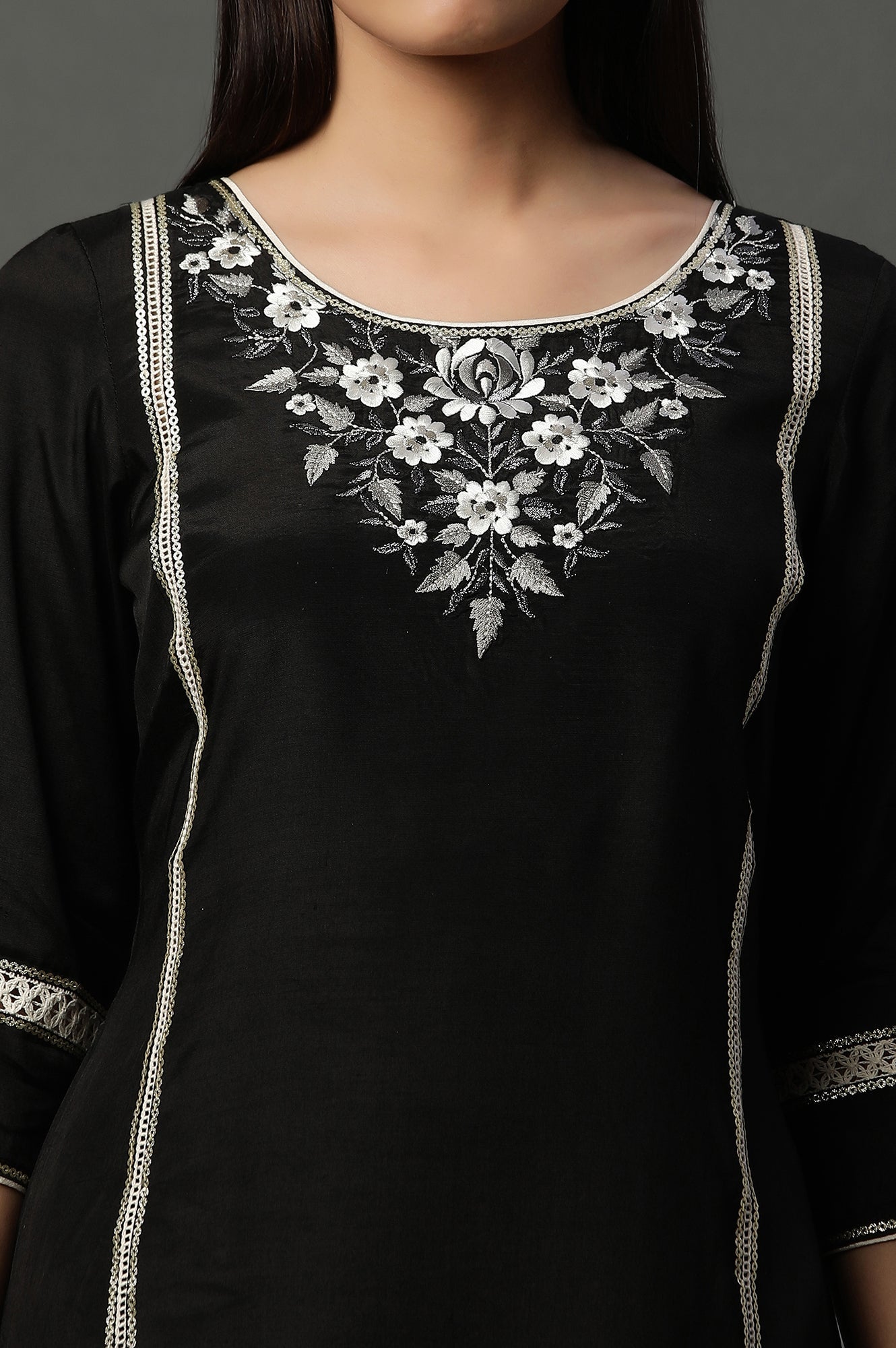Pair it with our black straight pants and a matching printed organza dupatta.