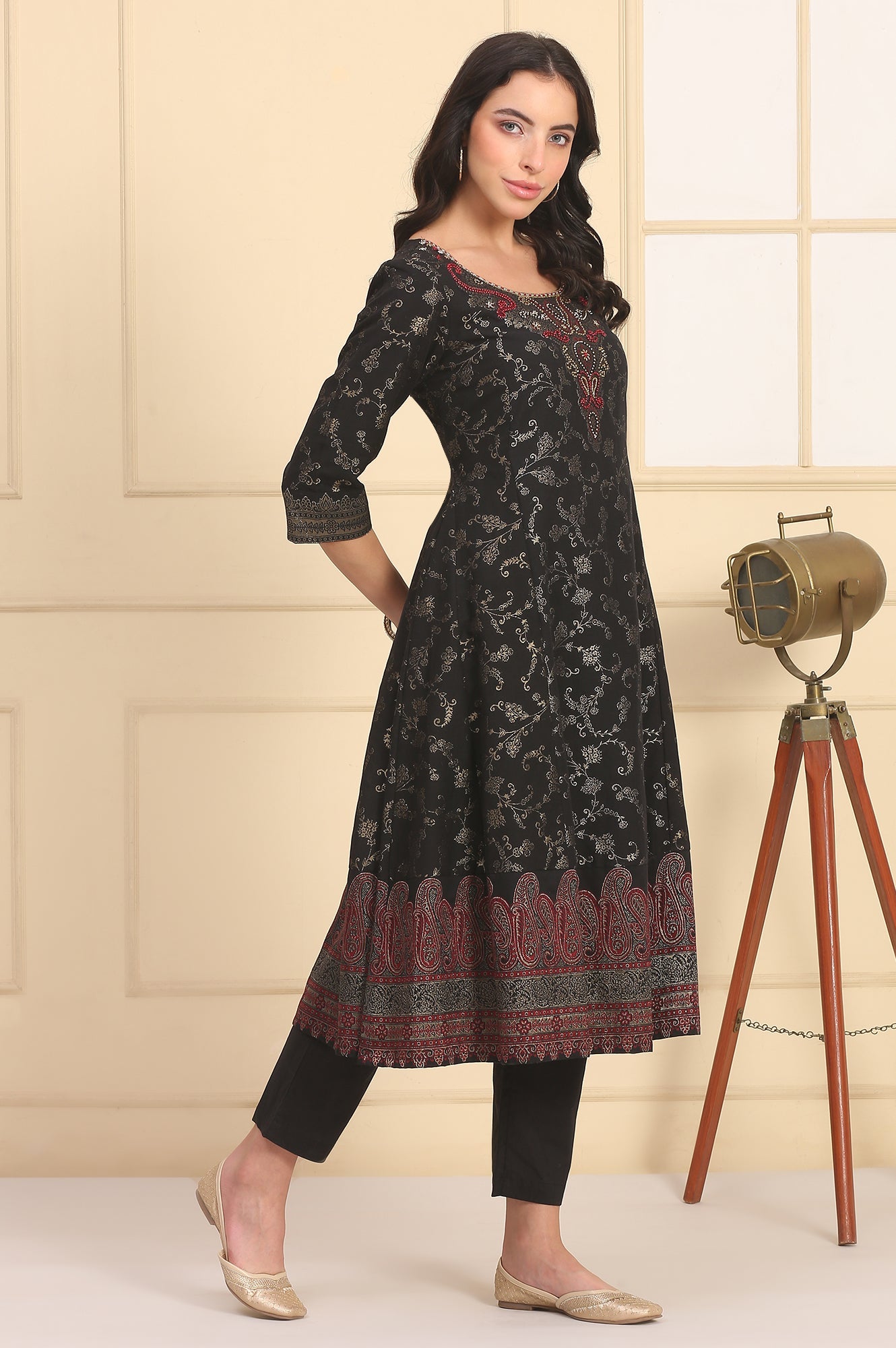 Indulge in festive finesse with this elegant black flared kurta set from Aurelia, comprising a kurta, trousers, and a dupatta. The set blends tradition and modernity with its calf-length silhouette, detailed bead ornamentation, and dyed/ombre pattern. Tailored in a polyester kurta paired with viscose rayon trousers and a cotton blend dupatta, it assures comfort and style. The round neck, 3/4th regular sleeves, and straight hemline add to its graceful appeal. With its woven texture, opaque finish, and yarn-dyed surface, this ensemble is crafted to impress. A refined choice for festive occasions, it reflects the charm of classic ethnic wear with contemporary poise.