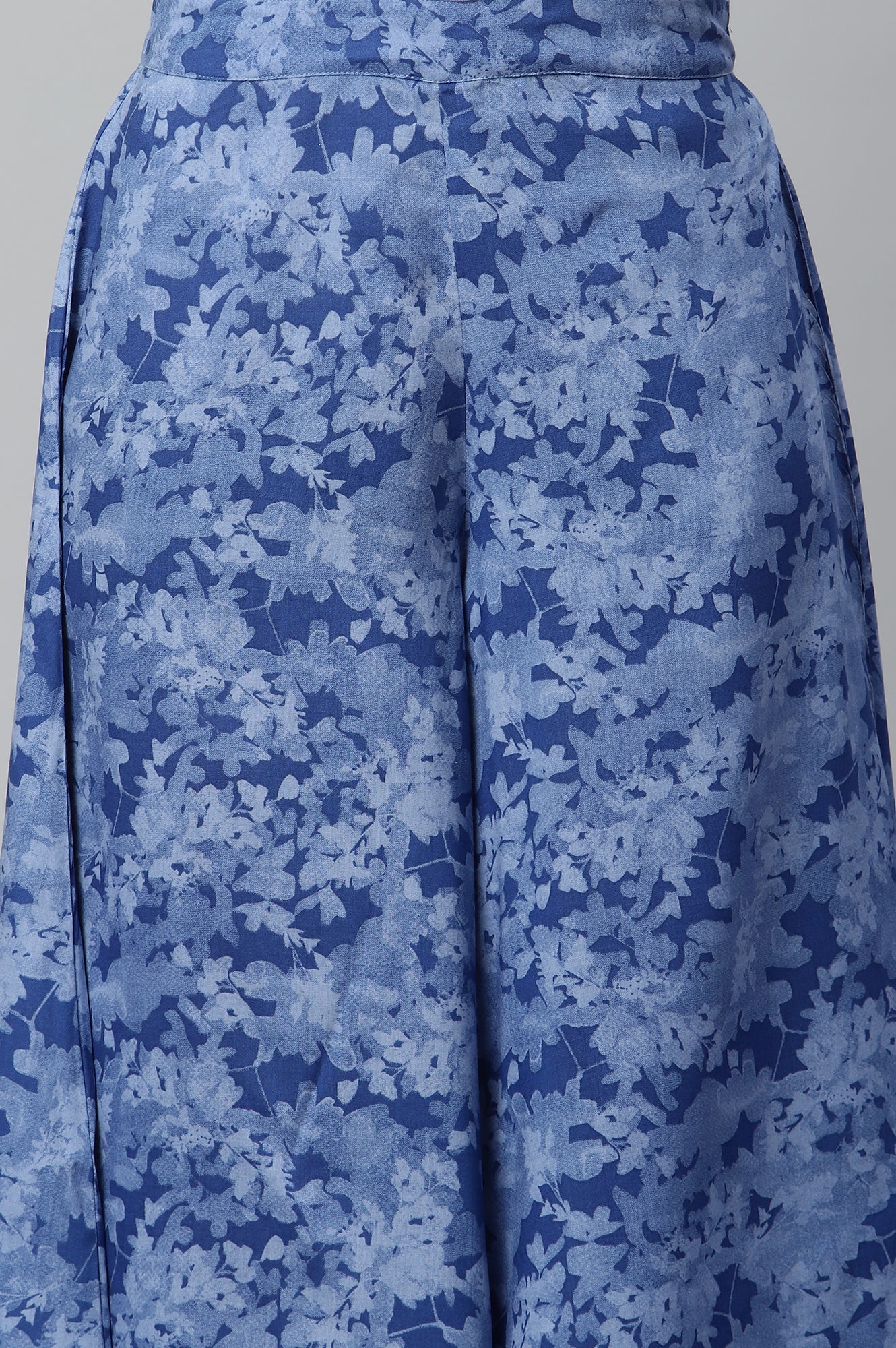 Elevate your look with these flowy flared culottes made in a monotonous blue foliage print in textured cotton fabric. It is a perfect combination of style and comfort.