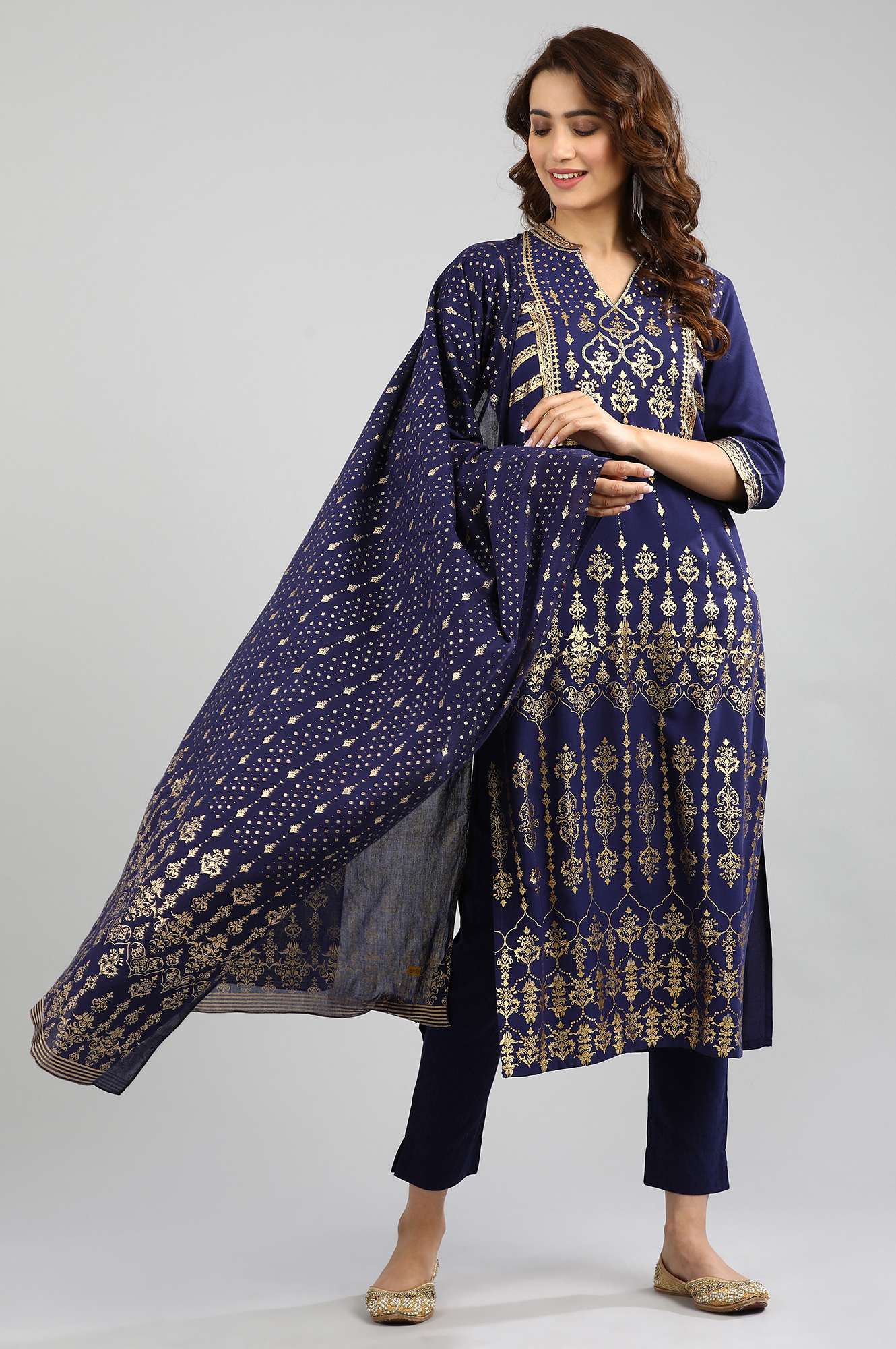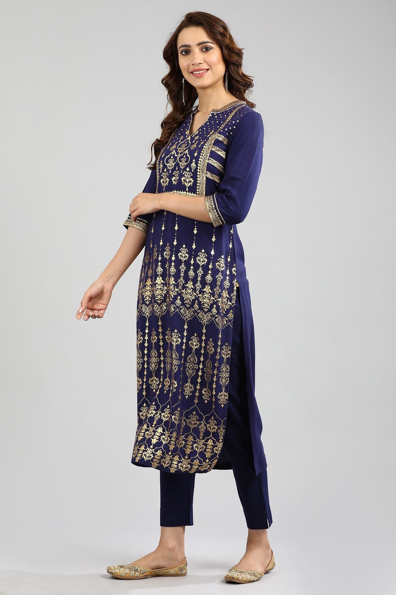 Blue Band Collar Printed kurta