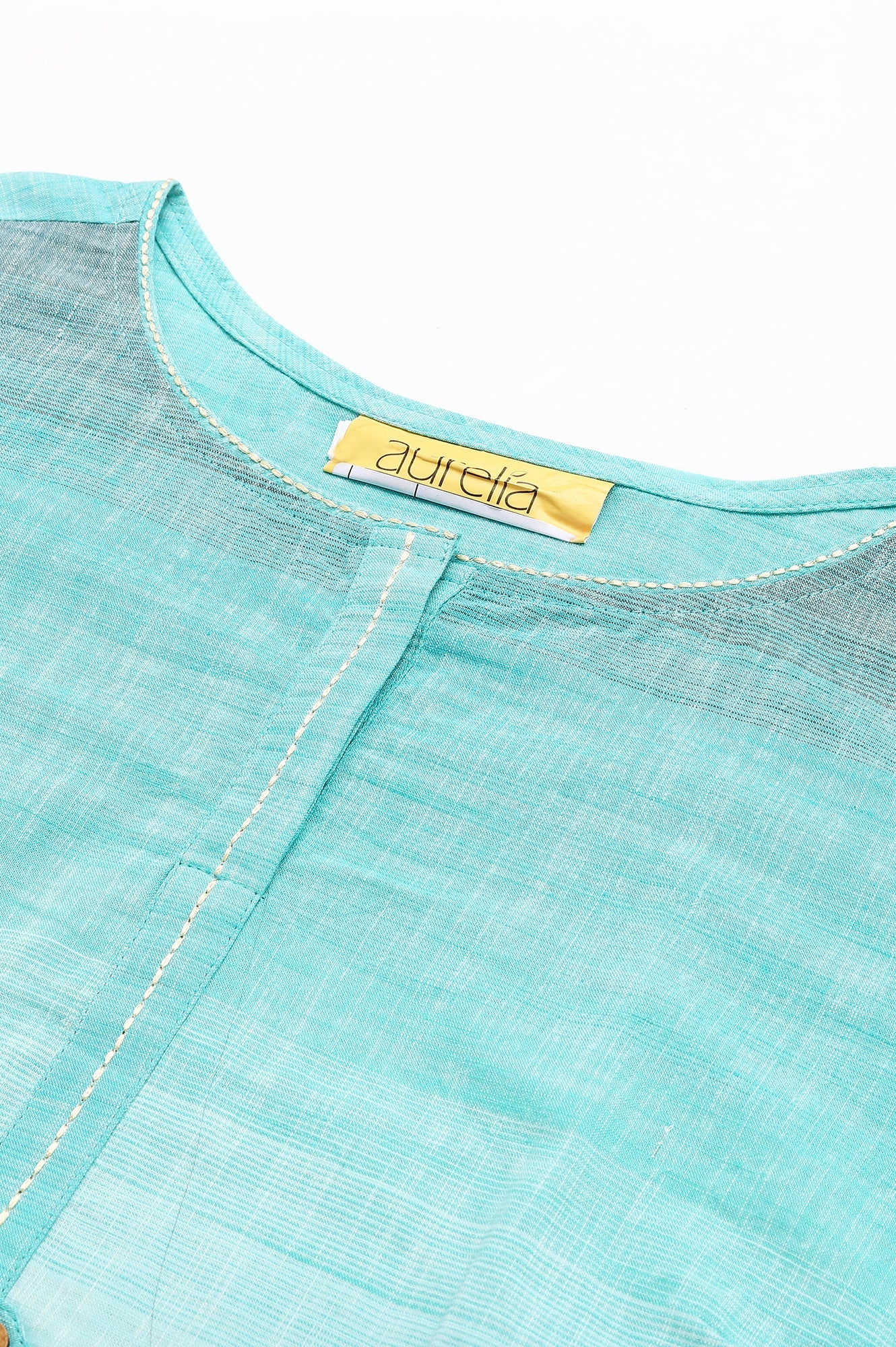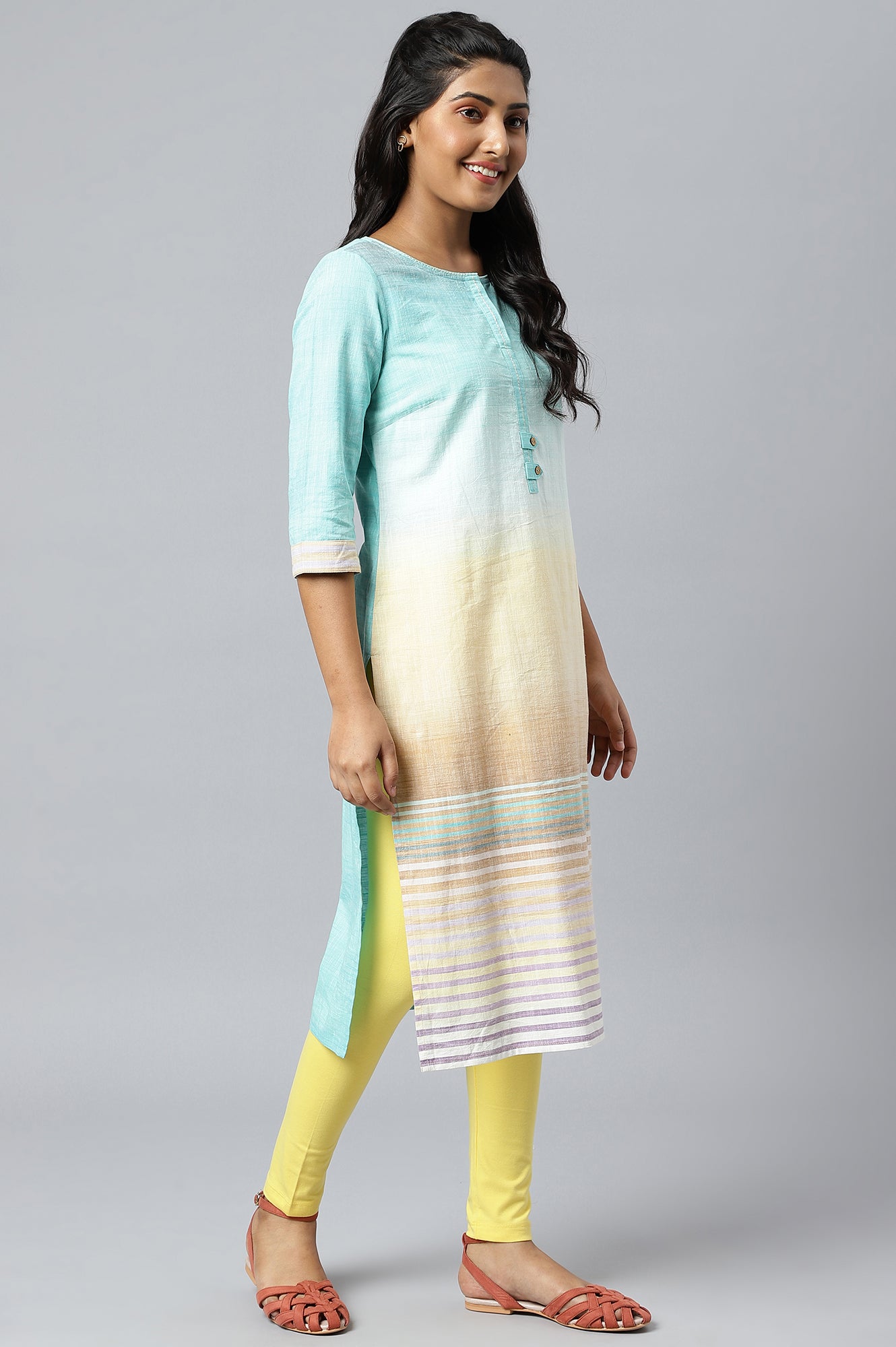 An exclusively curated kurta in textured cotton with a serene ombre of blue & yellow and a play of shaded stripes at the bottom. It can be paired with yellow palazzo. Add this to your collection and treat yourself.