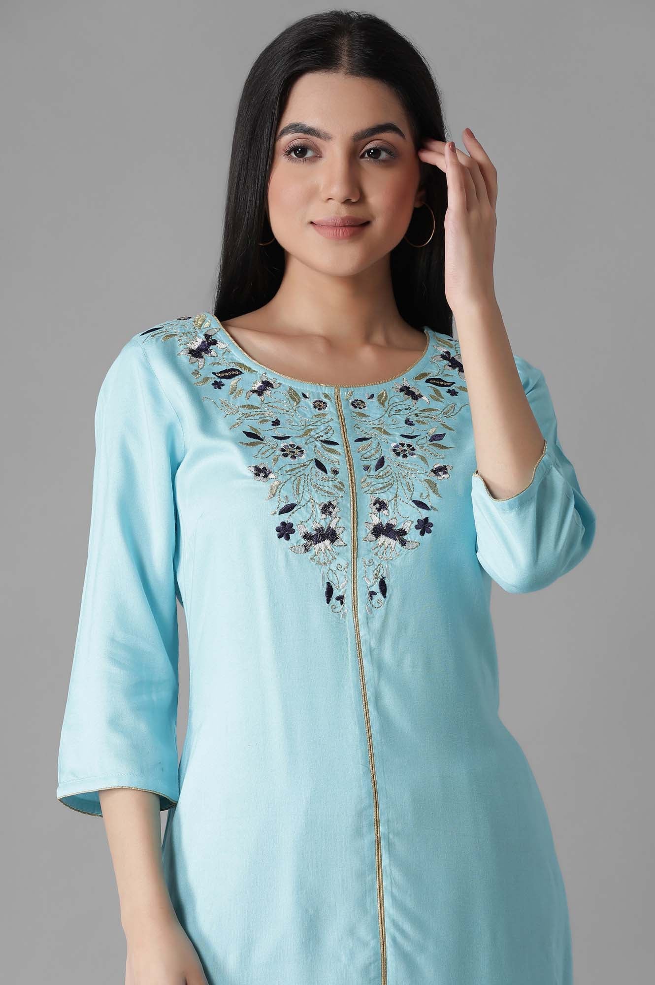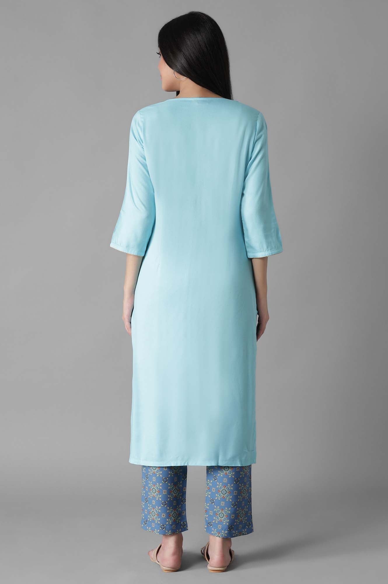 Be dressed la mode this festive season. Perfect for all occasions, this kurta set contains a blue solid panelled kurta having zari embroidered yoke with sequin embellished round neckline and three-quarter sleeves. Well-matched with stellar blue ankle length printed trousers.