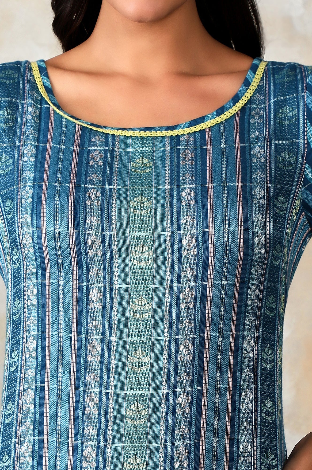 A well-cut kurta is a wardrobe essential. Our newest rendition comes with an impeccably curated dobby fabric that features colourful geometric floral motifs.