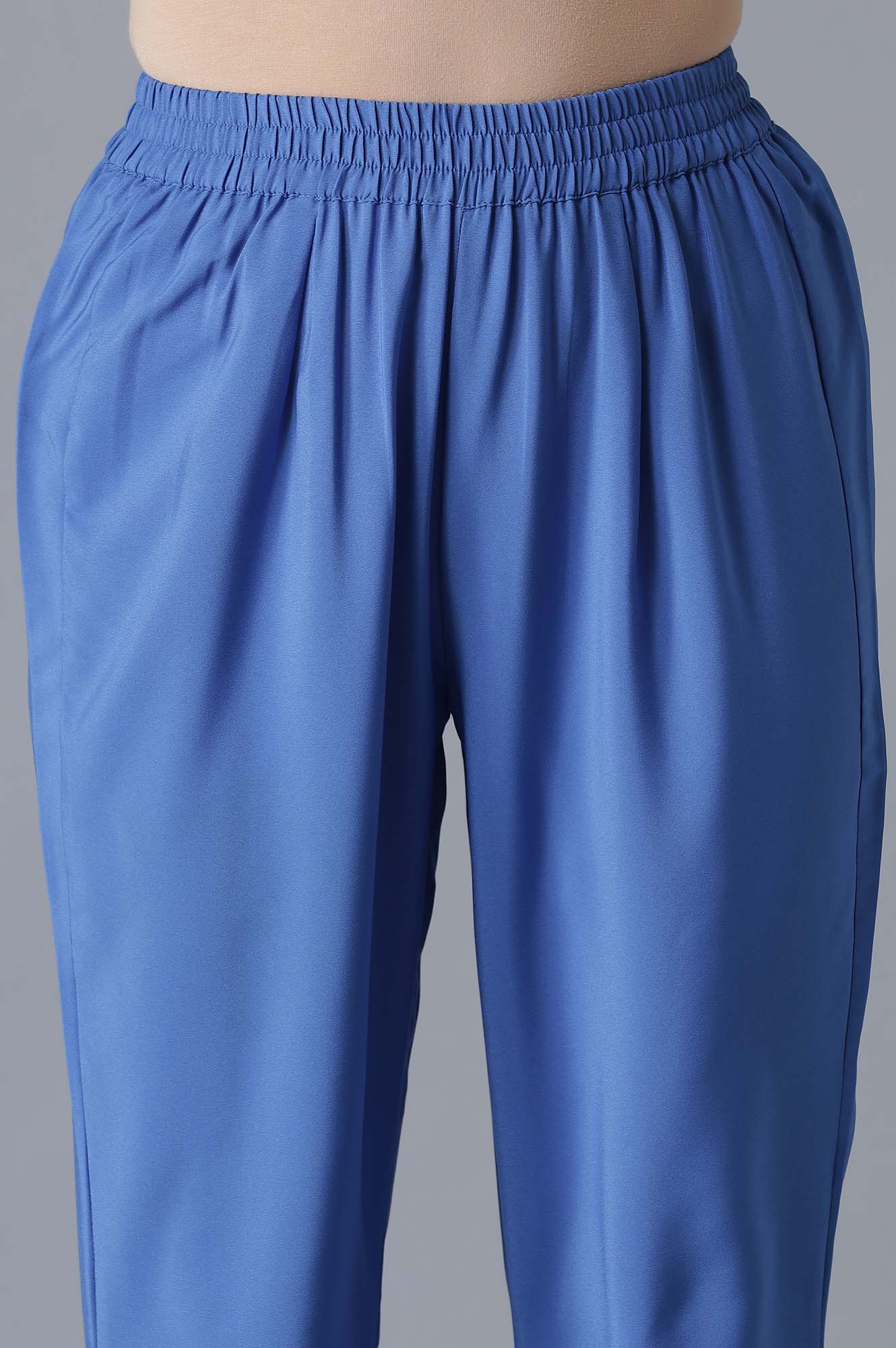 Chic ensembles designed to make you look gorgeous on the upcoming festivities. It features a blue glittered geometric print kurta having zari and thread embroidered round neck and three-quarter sleeves. Well-matched with ankle length slim fit solid trousers.