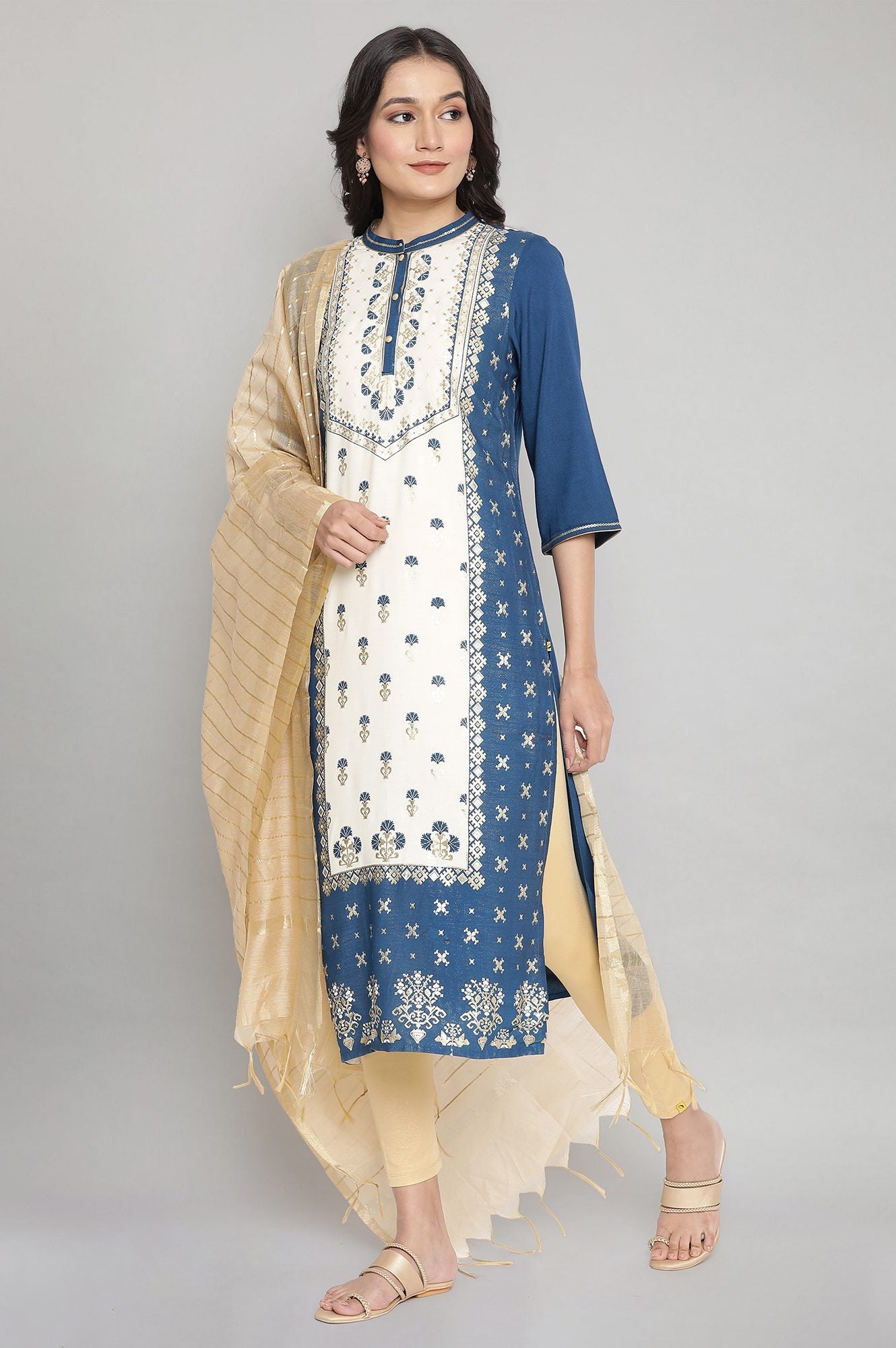 Sailor blue coloured straight kurta having ornamental foil print, sequin embellishment, mandrin collar with buttoned placket and three-quarter sleeves.
