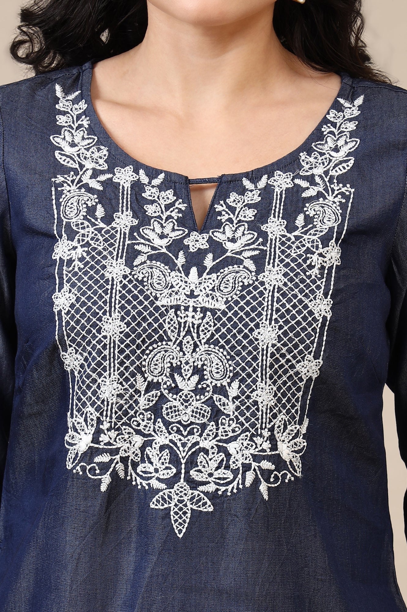 Blue Relaxed Fit Embroidered Yoke A-line Denim Kurta