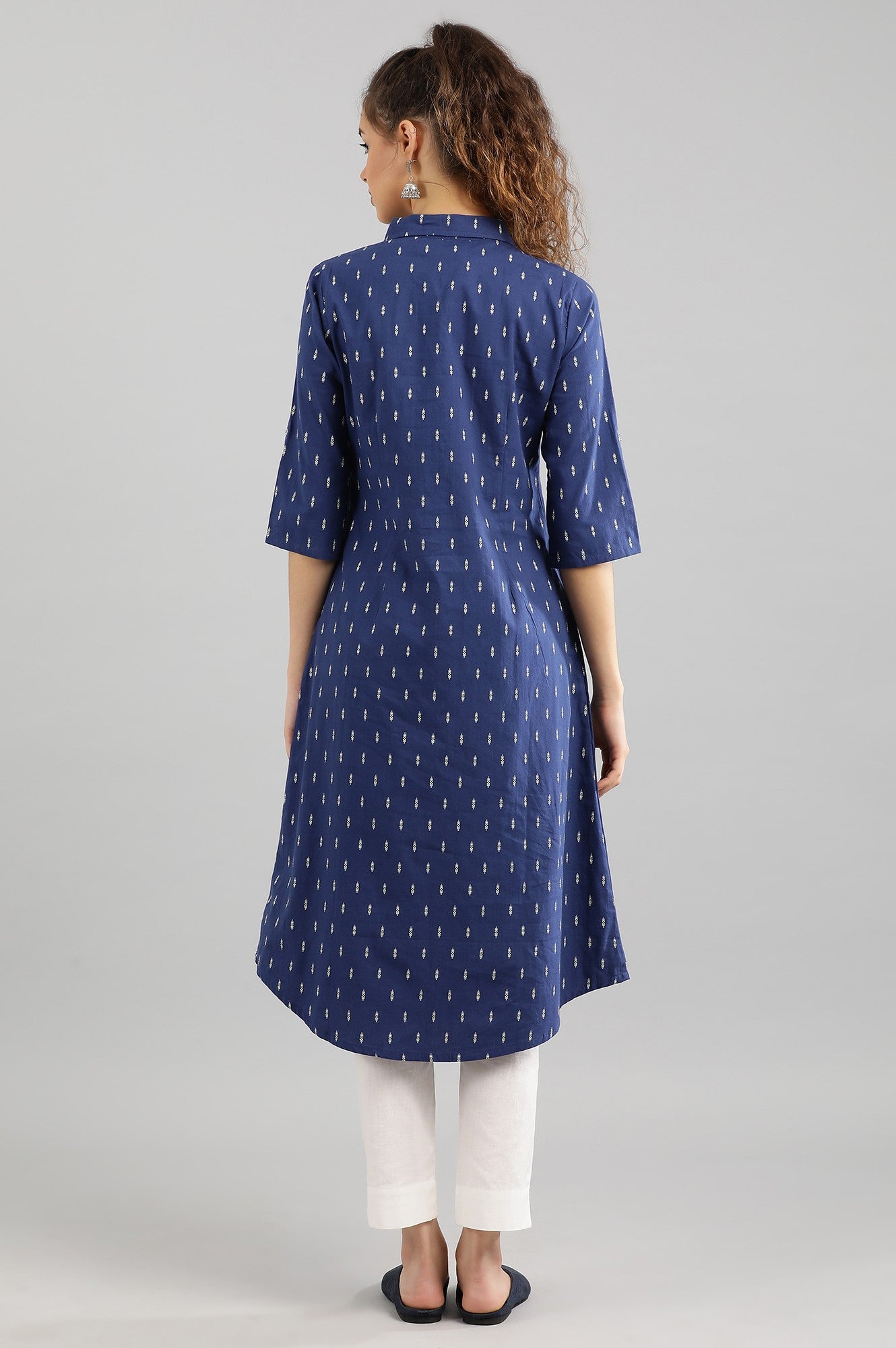 Navy blue Y/D A-line kurta in shirt collar with half placket and buttons. The kurta also features rolled-up sleeves.