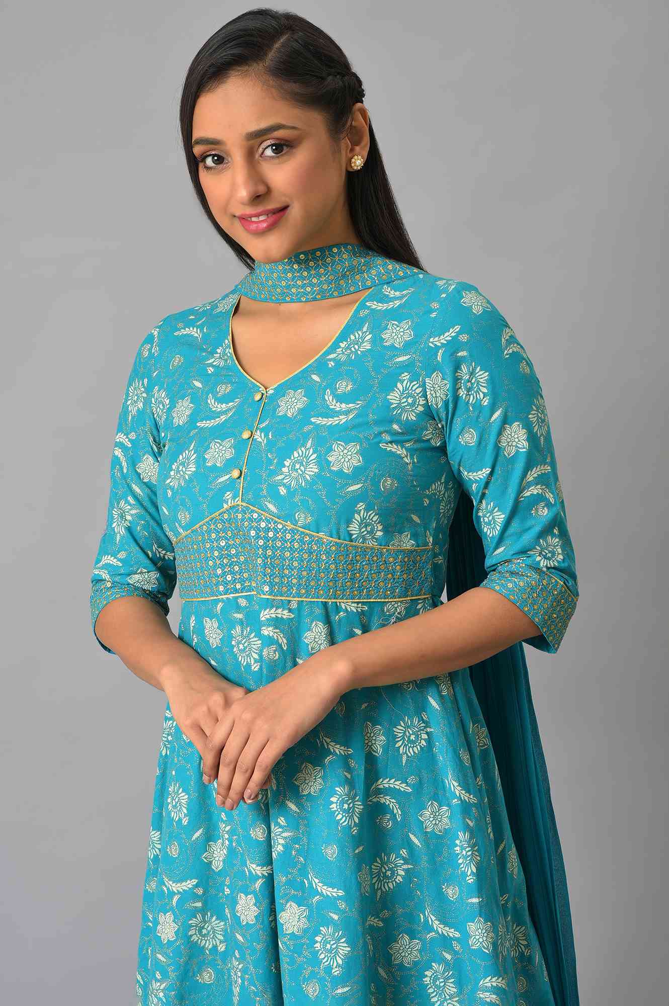 Swirl Around In This Kalidar Dress That Comes With An Embroidered Choker Neck Dupatta. The Dress Features An Interestingly Shaped Embroidered Belt. It Is Also Adorned With Golden Piping Insert And Gold Fabric Buttons.