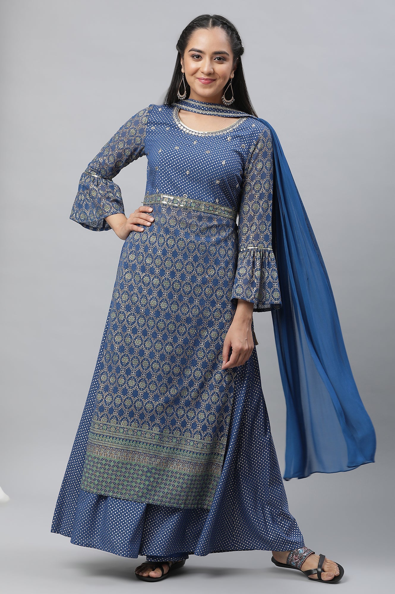 Bright Blue Embellished Kurta, Palazzo and Choker Dupatta