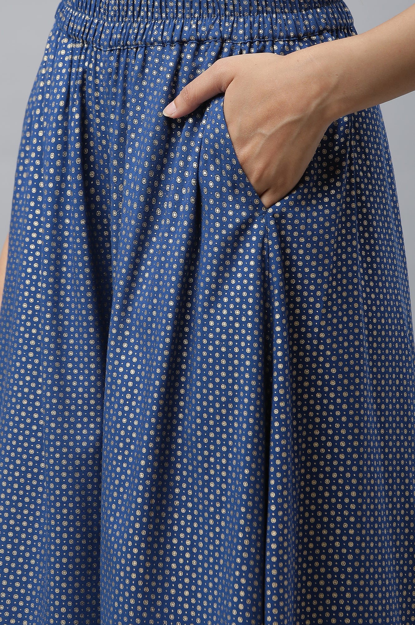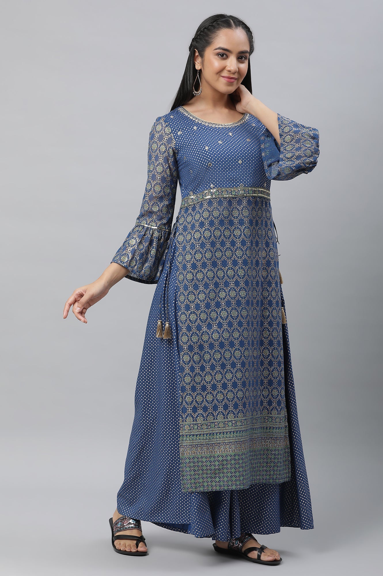 Treat yourself with this stylish high-slit kurta in printed georgette. It is a three piece set, which is a must-have for the festive or wedding look. The kurta of the set is paired with matching printed flared palazzo pants and has elegant embellished choker duapatta.
