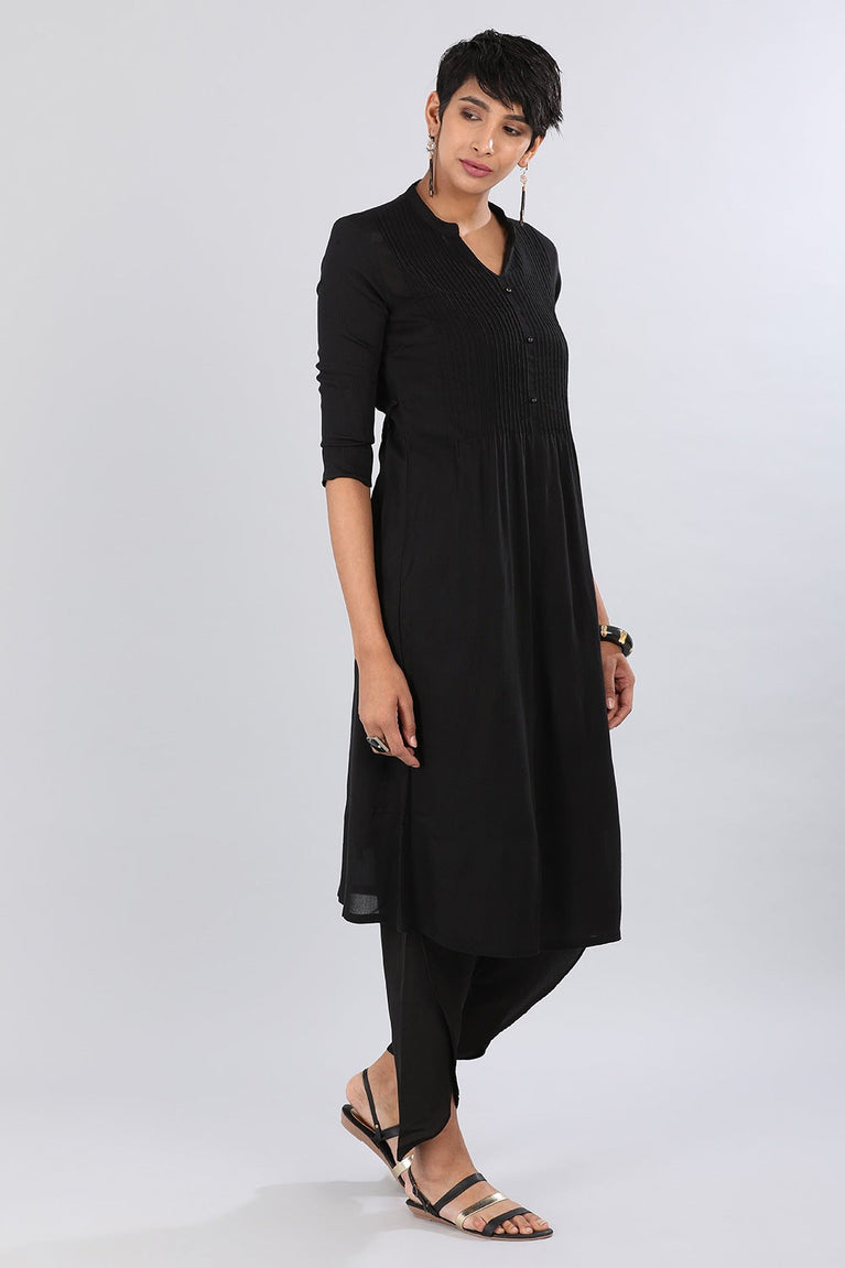 Make a graceful impression in this black straight kurta and palazzo set crafted from a soft cotton blend. Thread embroidery elevates the look with detailed finesse, while the solid black base adds sophistication. The combination of a straight-cut kurta and flared palazzos makes the outfit both modern and culturally rooted. Ideal for festive evenings, cultural meets, or even evening work events, this piece balances tradition and minimalism beautifully.