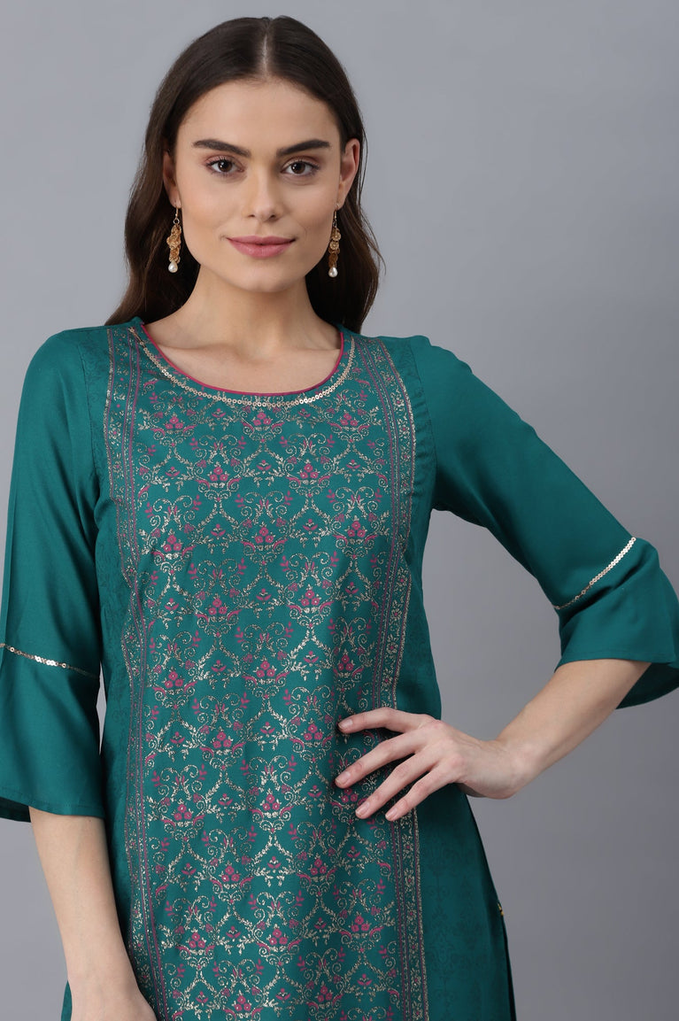 Blue round neck 3/4 sleeve kurta with printed detail.