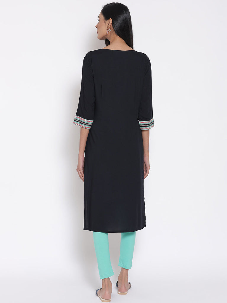 Get ready to make statement look in this casual LIVA kurta set. The set has black printed straight kurta in round neck and it is paired with skin fit tights.